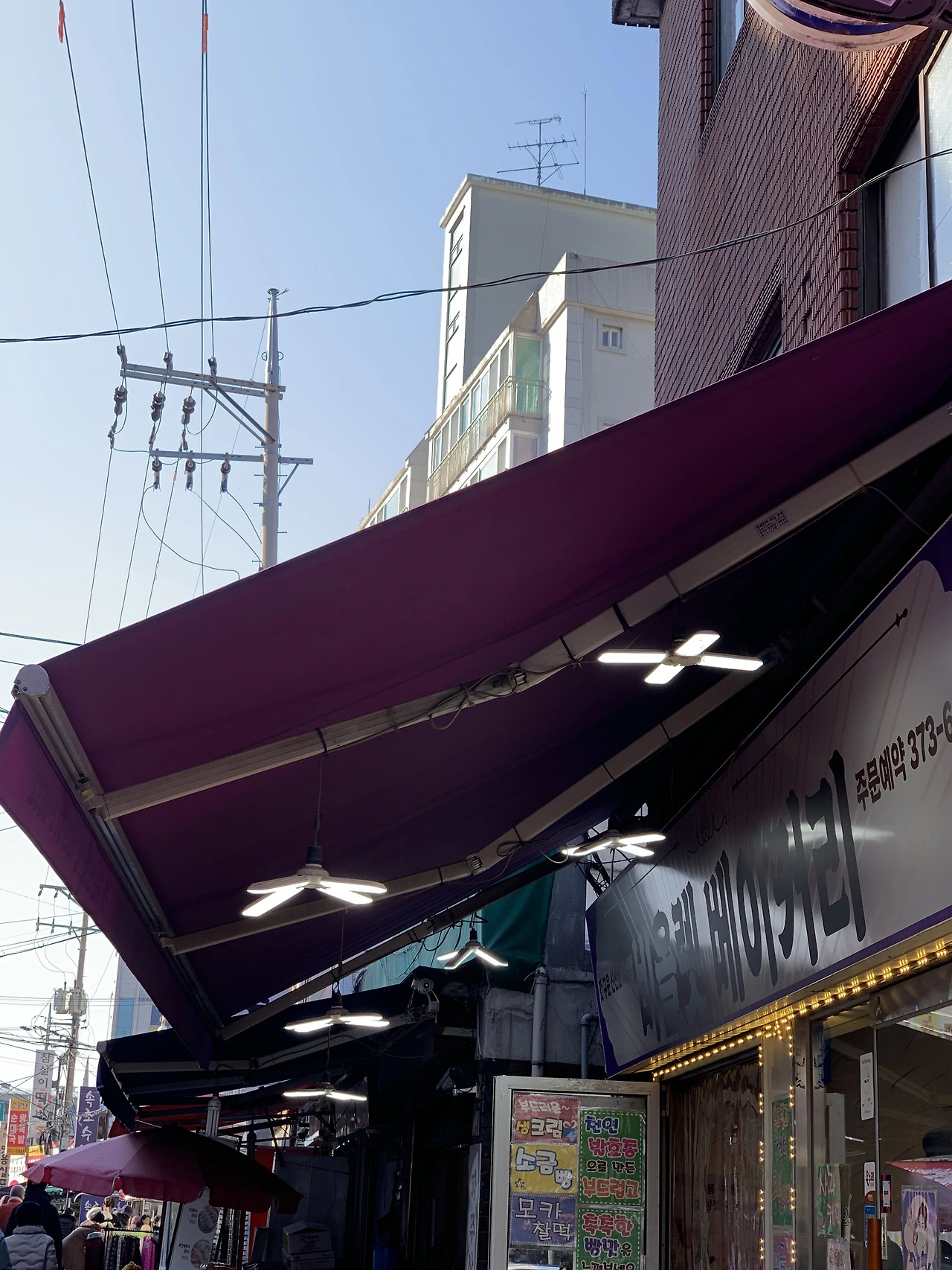 - 멀리서도 단번에 보이는 강렬한 보라색 어닝