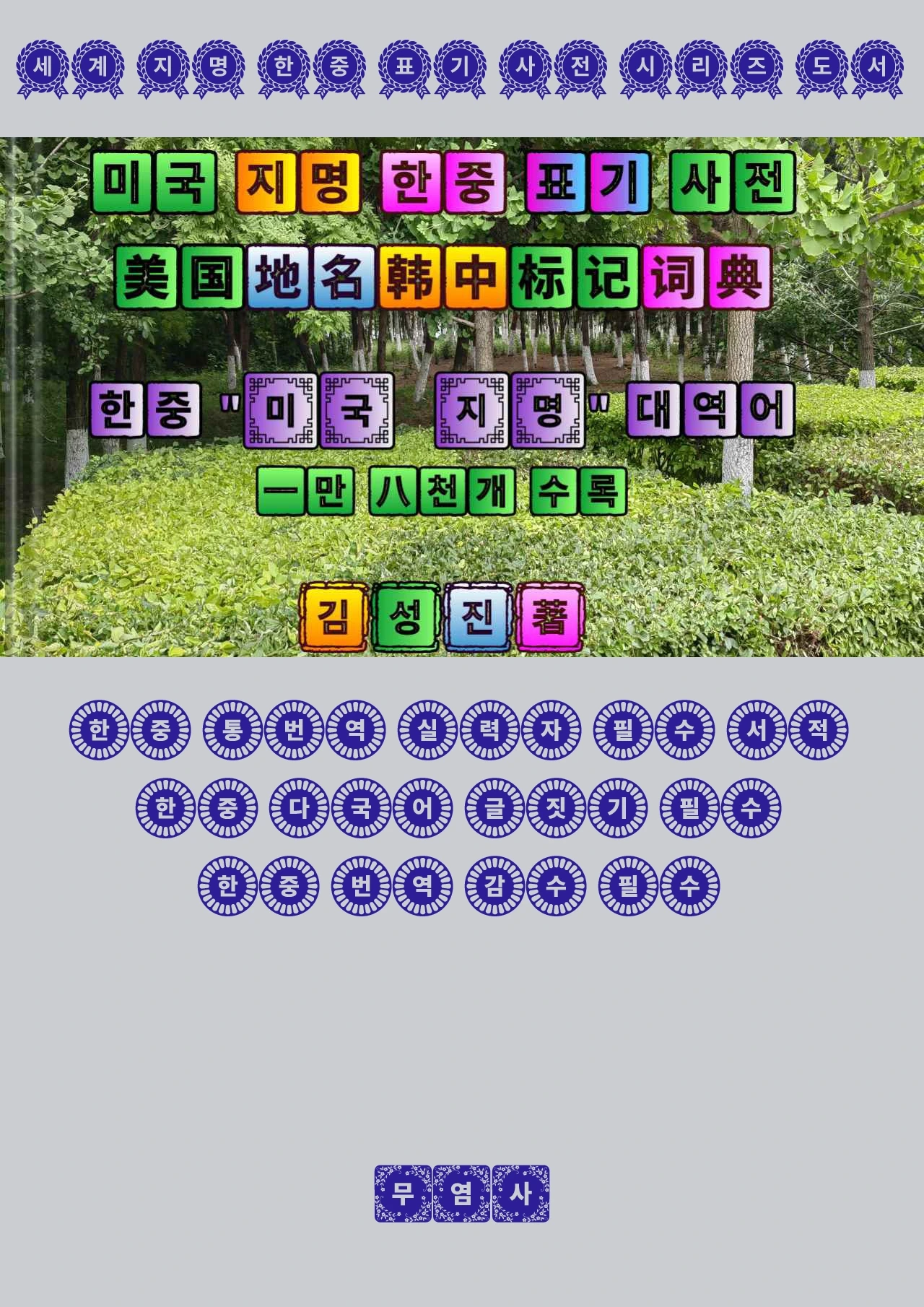 세계 지명 한중 표기 사전 시리즈 도서의 제1권인 이 책 "미국 지명 한중 표기 사전 (美国地名韩中标记词典)" 은 미국 지명의 한중 대역어 1만 8천개를 수록하고 있습니다.
