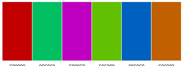 조화로운 배색 관계에 있는 6색을 같이 배열해 놓을 경우 서로의 매력적인 대비 효과로 인해 시선 집중의 홍보 실효(實效)를 최대화하게 됩니다.