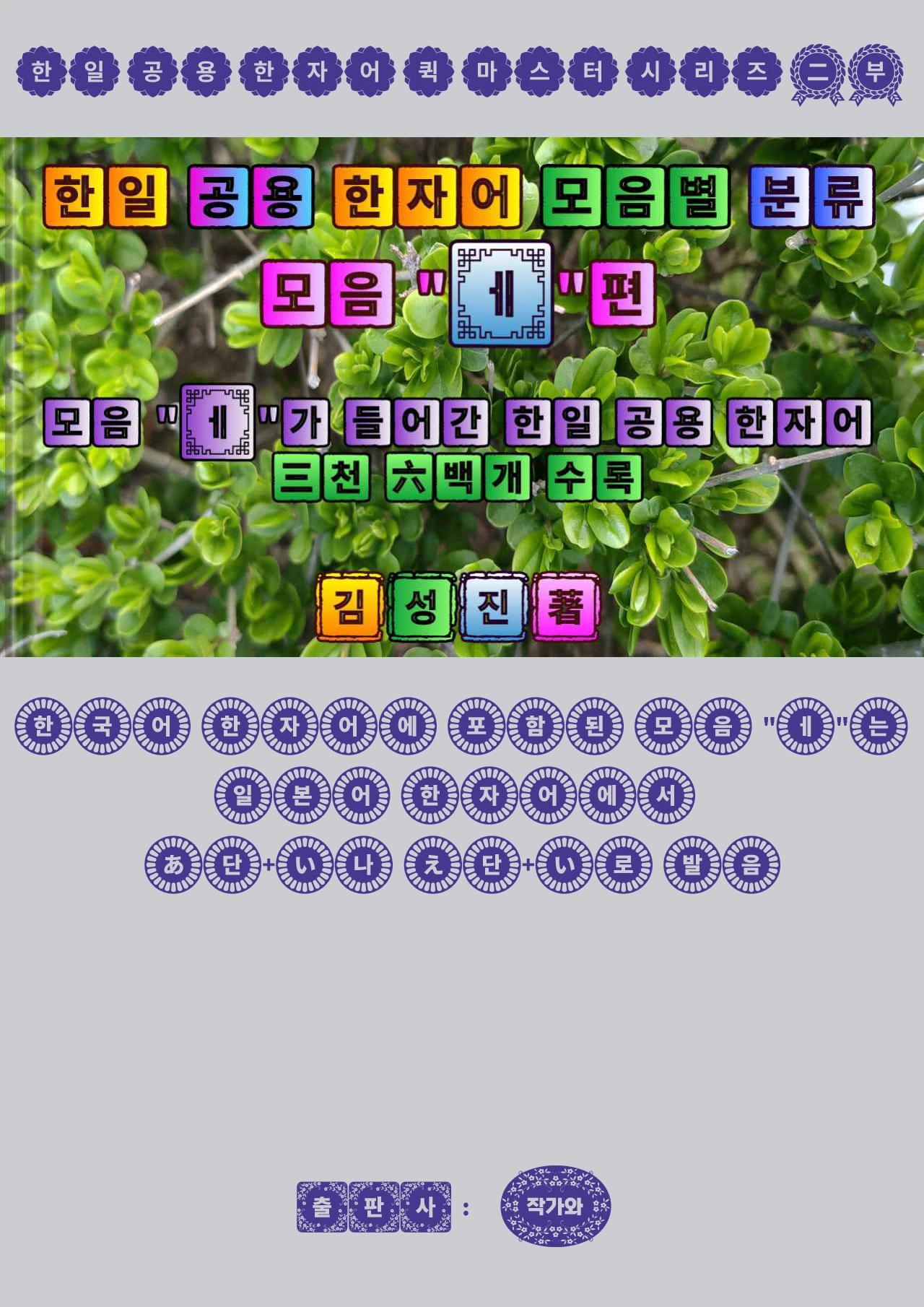 모음별 발음 매칭 룰은 앞서 출간한 한일 공용 한자어 퀵마스터 비법 공개 시리즈 도서 제1부(받침편)의 제7권인"한일 공용 한자어 발음별 분류 - 무(無) 받침편"에도 완벽하게 적용되는 매칭 룰이라 지인 분들의 이런 시의적절한 요구에 부응해 그동안 본인의 한일 공용 한자어 연구 과제로 꾸준히 진행해 온 해당 모음별 매칭룰 분류 연구의 결과물을 18권의 도서로 신규 편저하여 추가로 발간하게 되었습니다.