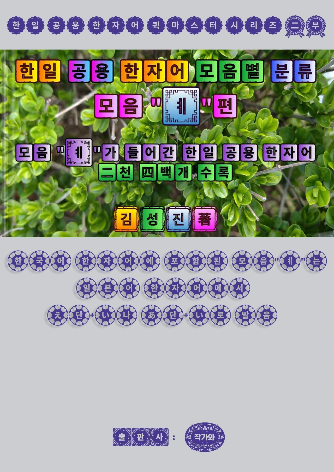 한일 공용 한자어 퀵마스터 비법 공개 시리즈 도서 제2부의 제7권인 이 책 "한일 공용 한자어 모음별 분류 - 모음 'ㅖ'편"은 한국어와 일본어에 공통으로 사용 중인 한자어 8만개 중에서 모음 "ㅖ"가 들어간 한일 공용 한자어 2천 4백개를 따로 추출하여 수록함으로써 저서에서 제시하고 있는 한일 공용 한자어의 발음 매칭 룰에 의해 짧은 시간내에 한일 공용 한자어를 보다 많이 그리고 빨리 익힐 수 있는 길을 열어 드리고 있습니다.