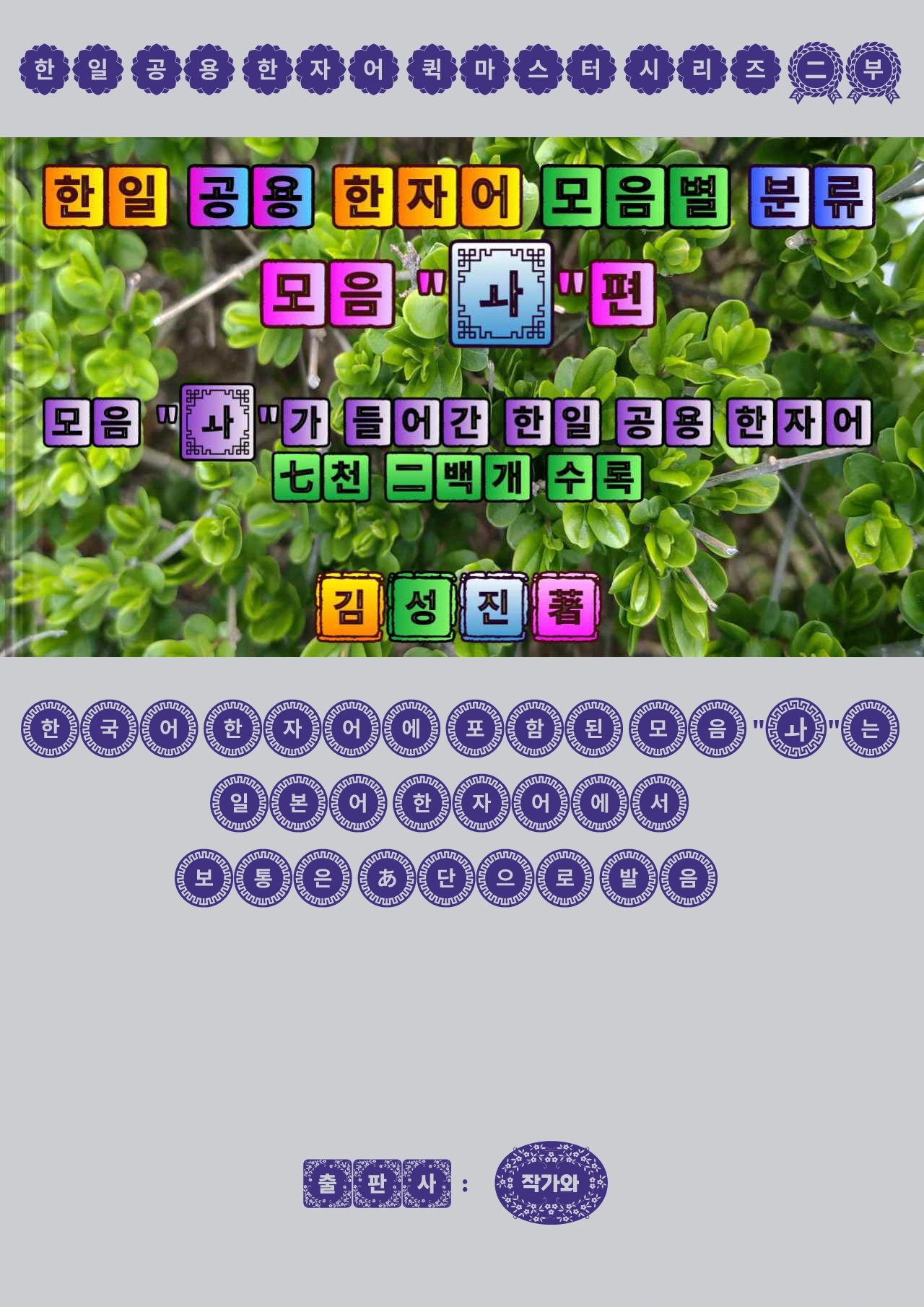 한일 공용 한자어 퀵마스터 비법 공개 시리즈 도서 제2부의 제9권인 이 책 "한일 공용 한자어 모음별 분류 - 모음 'ㅘ'편"은 한국어와 일본어에 공통으로 사용 중인 한자어 8만개 중에서 모음 "ㅘ"가 들어간 한일 공용 한자어 7천 2백개를 따로 추출하여 수록함으로써 저서에서 제시하고 있는 한일 공용 한자어의 발음 매칭 룰에 의해 짧은 시간내에 한일 공용 한자어를 보다 많이 그리고 빨리 익힐 수 있는 길을 열어 드리고 있습니다.