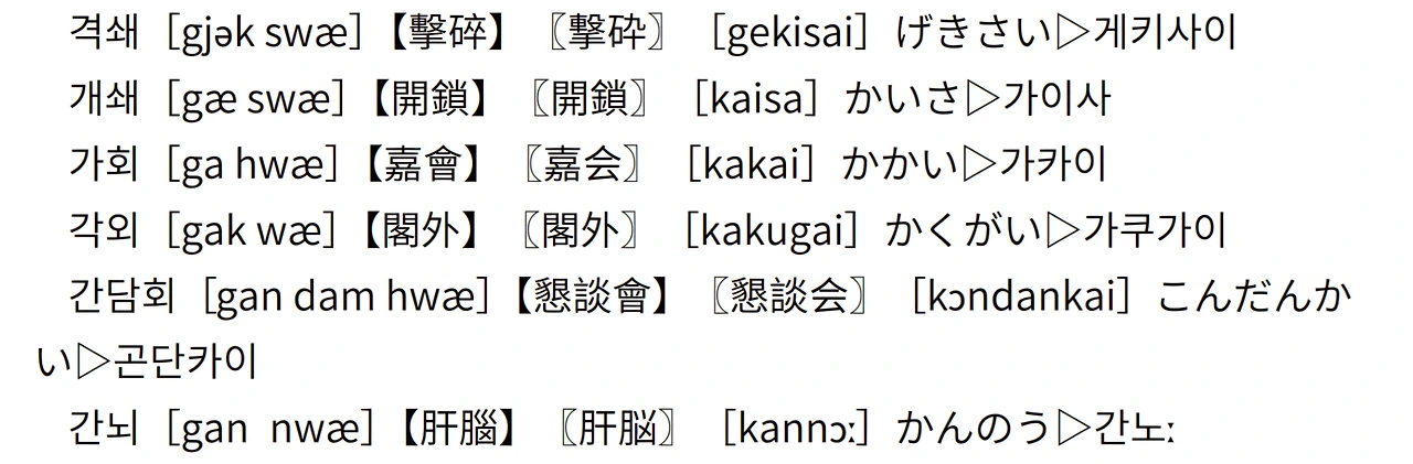 1. 한국어 한자어에 포함된 모음 "ᅫ"는 일본어 한자어에서 보통은 あ단+い로 발음되고 あ단으로 발음되는 경우도 있음.