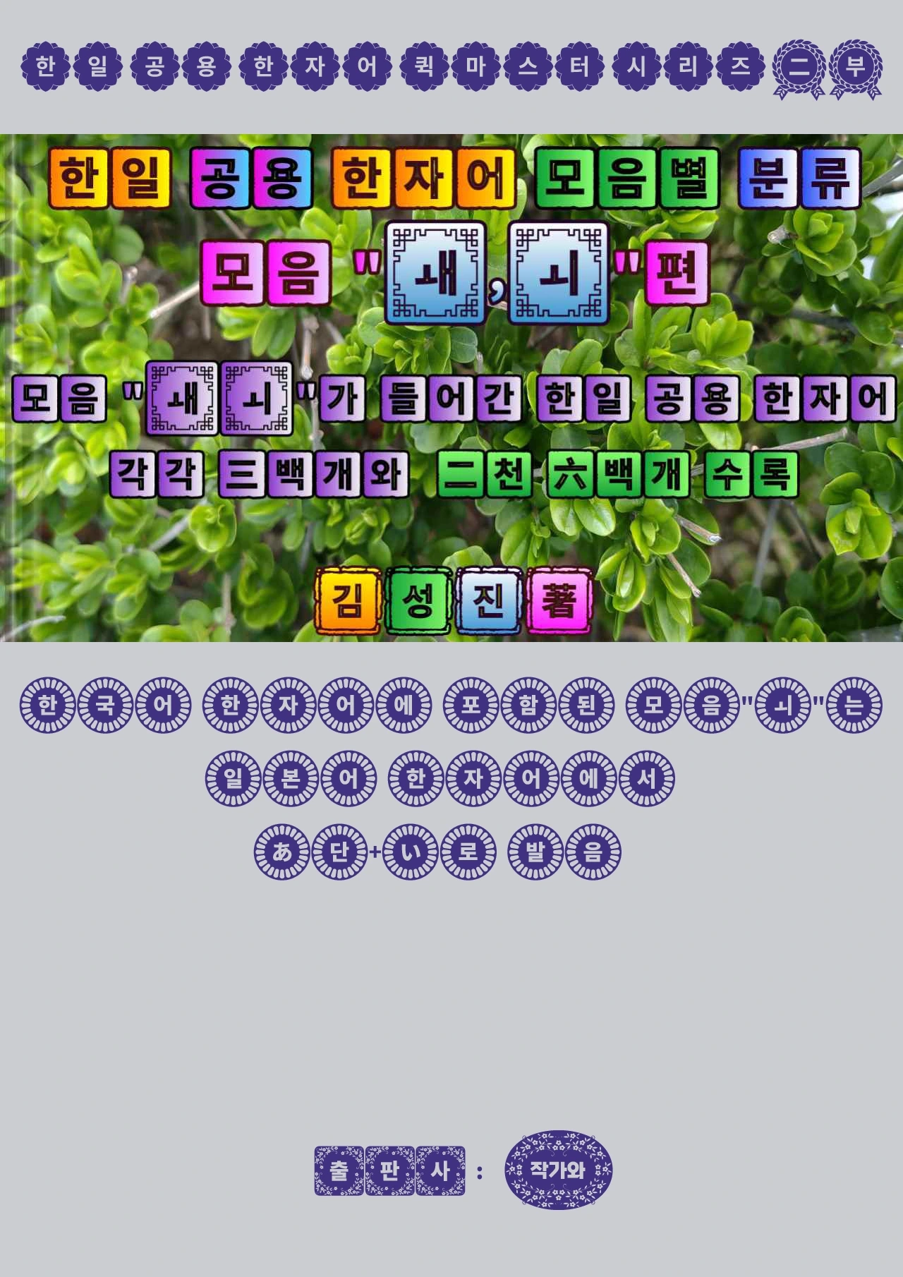 한일 공용 한자어 퀵마스터 비법 공개 시리즈 도서 제2부의 제10권인 이 책 "한일 공용 한자어 모음별 분류 - 모음 'ㅙ,ㅚ'편"은 한국어와 일본어에 공통으로 사용 중인 한자어 8만개 중에서 모음 "ㅙ,ㅚ"가 들어간 한일 공용 한자어 각각 293개와 2천 6백개를 따로 추출하여 수록함으로써 저서에서 제시하고 있는 한일 공용 한자어의 발음 매칭 룰에 의해 짧은 시간내에 한일 공용 한자어를 보다 많이 그리고 빨리 익힐 수 있는 길을 열어 드리고 있습니다.