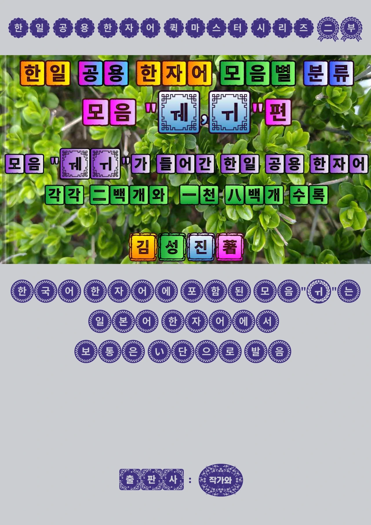 모음별 발음 매칭 룰은 앞서 출간한 한일 공용 한자어 퀵마스터 비법 공개 시리즈 도서 제1부(받침편)의 제7권인"한일 공용 한자어 발음별 분류 - 무(無) 받침편"에도 완벽하게 적용되는 매칭 룰이라 지인 분들의 이런 시의적절한 요구에 부응해 그동안 본인의 한일 공용 한자어 연구 과제로 꾸준히 진행해 온 해당 모음별 매칭룰 분류 연구의 결과물을 18권의 도서로 신규 편저하여 추가로 발간하게 되었습니다.