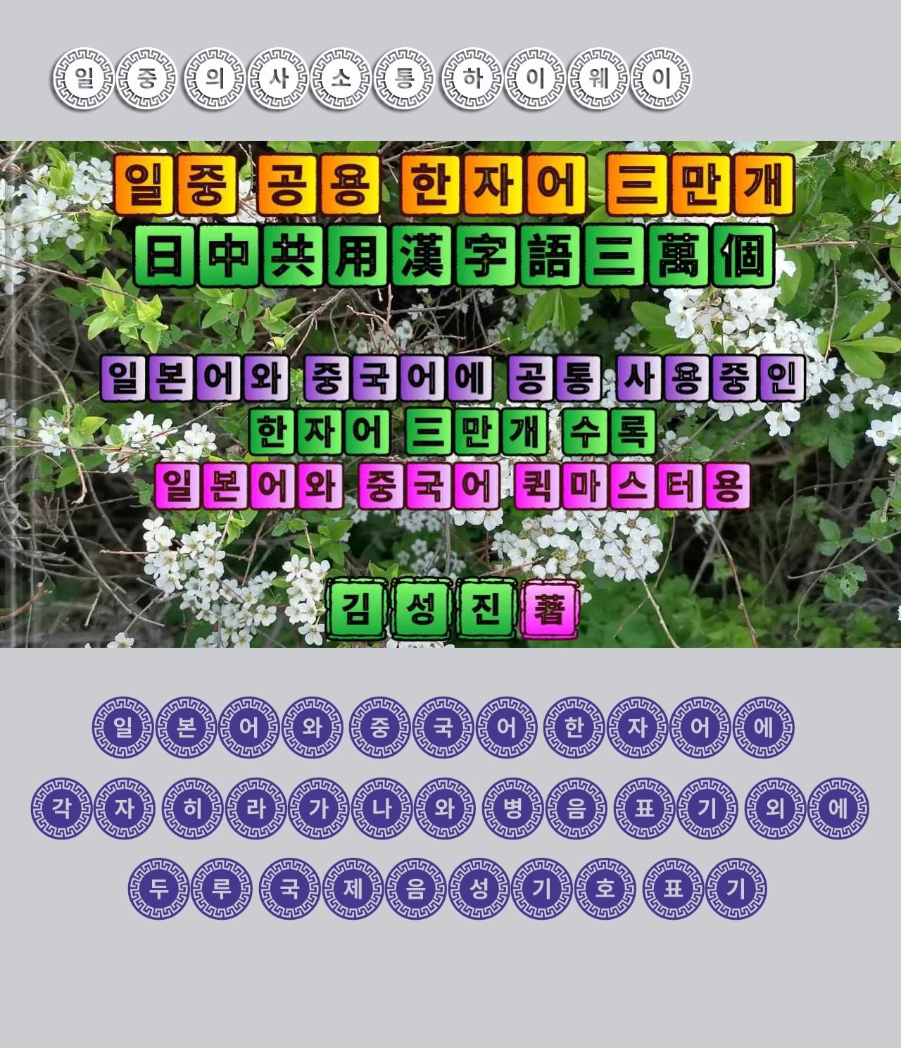 부연하여 말씀드리면 가장 먼저 지은 책은 일본어 늘리는 지름길 "한일 공용 한자어 8만개"이고 그 다음 지은 책이 중국어 고수(高手)되는 지름길 "한중 공용 한자어 6만개"이며 그 후에 지은 책이 한중일 의사소통 하이웨이 "한중일 공용 한자어 3만개"이고 나중에 지은 책이 지금 보시는 "일중 공용 한자어 3만개" 저서입니다.