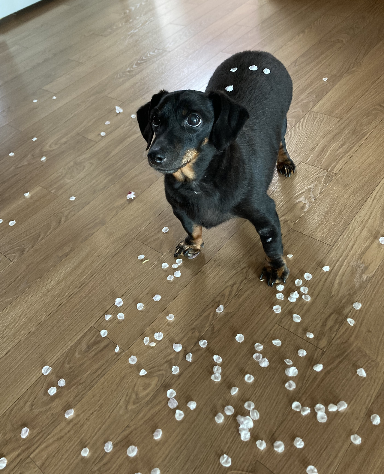 벚꽃이 한창이던 때 하필 코로나에 걸렸다며 엄마는 밖에나가 벚꽃잎을 잔뜩 주워와 내 앞에 뿌렸다. 그리고 강아지랑 같이 신나게 벚꽃을 맞았다. 나만 신났던가. 강아지는 저 인간 왜저러나 하는 눈으로 바라봤던걸까. 먹을거 아니라고 실망했던걸까. 말똥말똥하게 뜬 눈이 참 예쁘게 나온 사진이다.