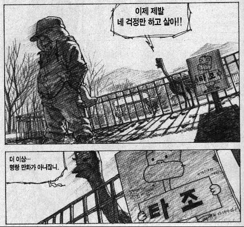 아기공룡 둘리가 20주년을 맞아 부천 명예시민이 되던 2003년, <송곳>의 원작자 최규석은 둘리와 친구들의 20년 후를 그려냈다. <공룡둘리에 대한 슬픈 오마주>에서 둘리는 공장 노동 중 기계에 손가락이 잘려 더 이상 마법을 쓰지 못하고, 또치는 동물원에서 타조들에게 몸을 팔며 살아가고, 도우너는 연구실로 끌려가 해부를 당한다. 최규석이 그려낸 둘리의 20년 후가 잔인하게 느껴지는 것은 한국이라면 충분히 가능한 현실과 맞닿아 있기 때문이다. 둘리 일행 이외에도 도우너의 투자 권유에 넘어가 전재산을 날린 고길동, 교도소를 들락날락 거리는 희동이, 이 모든 상황을 통제하지 못하고 도우너를 천이백만원에 팔아넘긴 철수는 신자유주의가 고도로 발달된 2000년대의 현실에 대한 우화적인 판본이다.