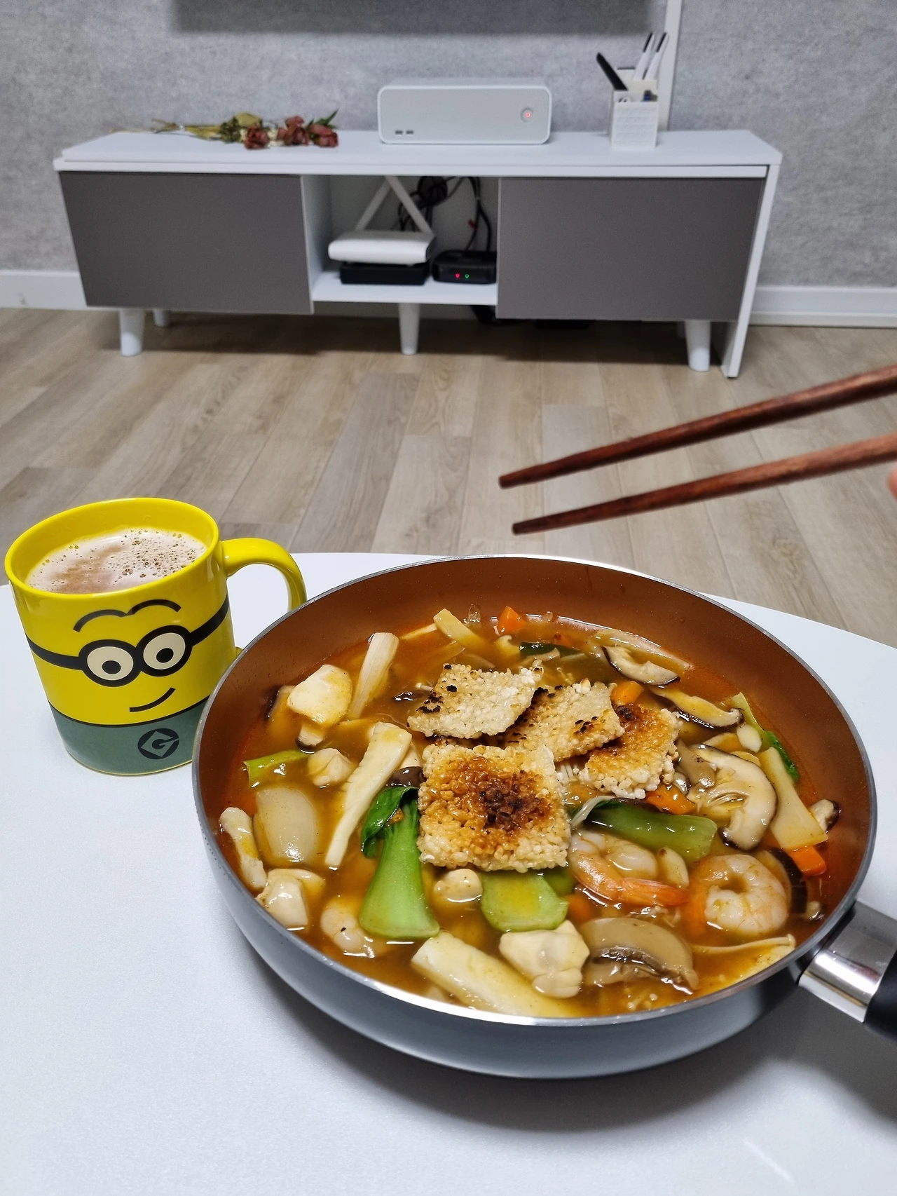 집주인은 해물 누룽지탕을 해주기로 했다. 크림파스타랑 해물누룽지탕이랑 누들떡볶이 중에 선택하라고 했는데, 역시나 쉽게 맛보기 힘든 해물 누룽지탕을 선택할 줄 알았지~