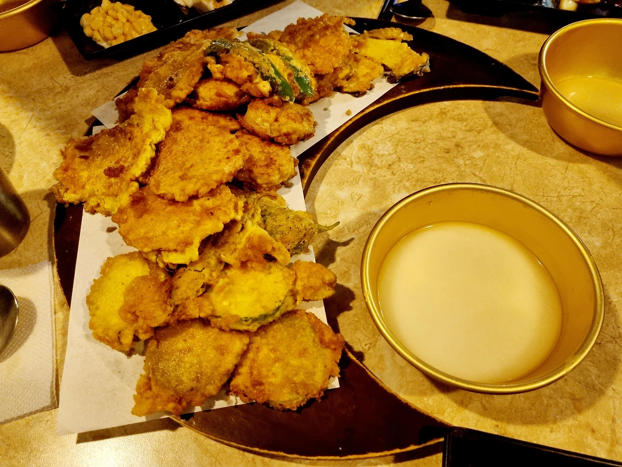 비오는날 막걸리. 혼자 먹기에 많은 음식을 같이 먹을 수 있다니!