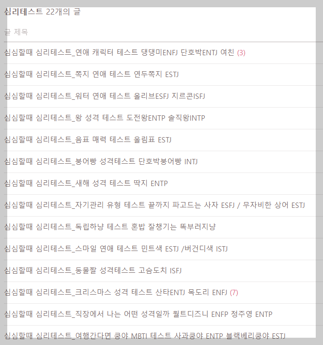 2030의 싱글들이 150명 모여있는 카톡방에 들어가 있는데, 누군가가 심리테스트를 짠~ 올려주었다. 누구나 재밌어하고 좋아하는 심리테스트. 올릴 때마다 사람들이 득달같이 모여들어서 다들 해보고 있었다. '나도 심심하니 한번 해볼까' 그렇게 한동안 매일매일 새로운 심리테스트가 생길 때마다 계속해보았다. 그렇게 나온 나의 결과들을 재밌어서 조금씩 블로그에 모아놓았더니 어느새 20개가 넘어버렸다.