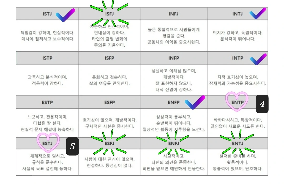 ESTJ 5번, ENTP 4번, 녹색 반짝이 2번씩, 체크 표시는 각 1번씩 나왔다.