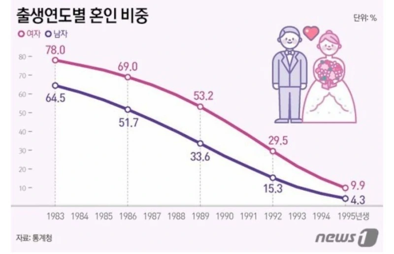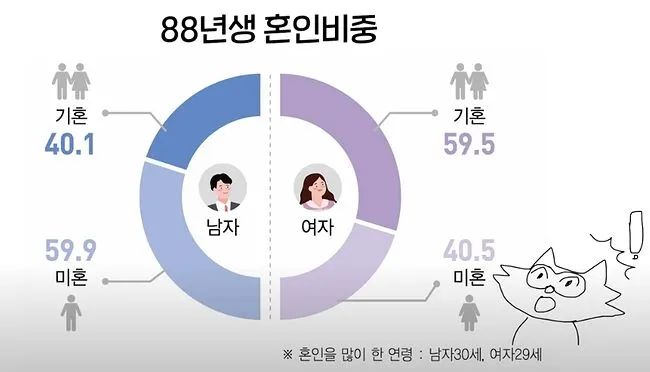 통계청 자료에 따르면 88년생 기준 혼인비중은 남자 40%, 여자 60% 랜다.