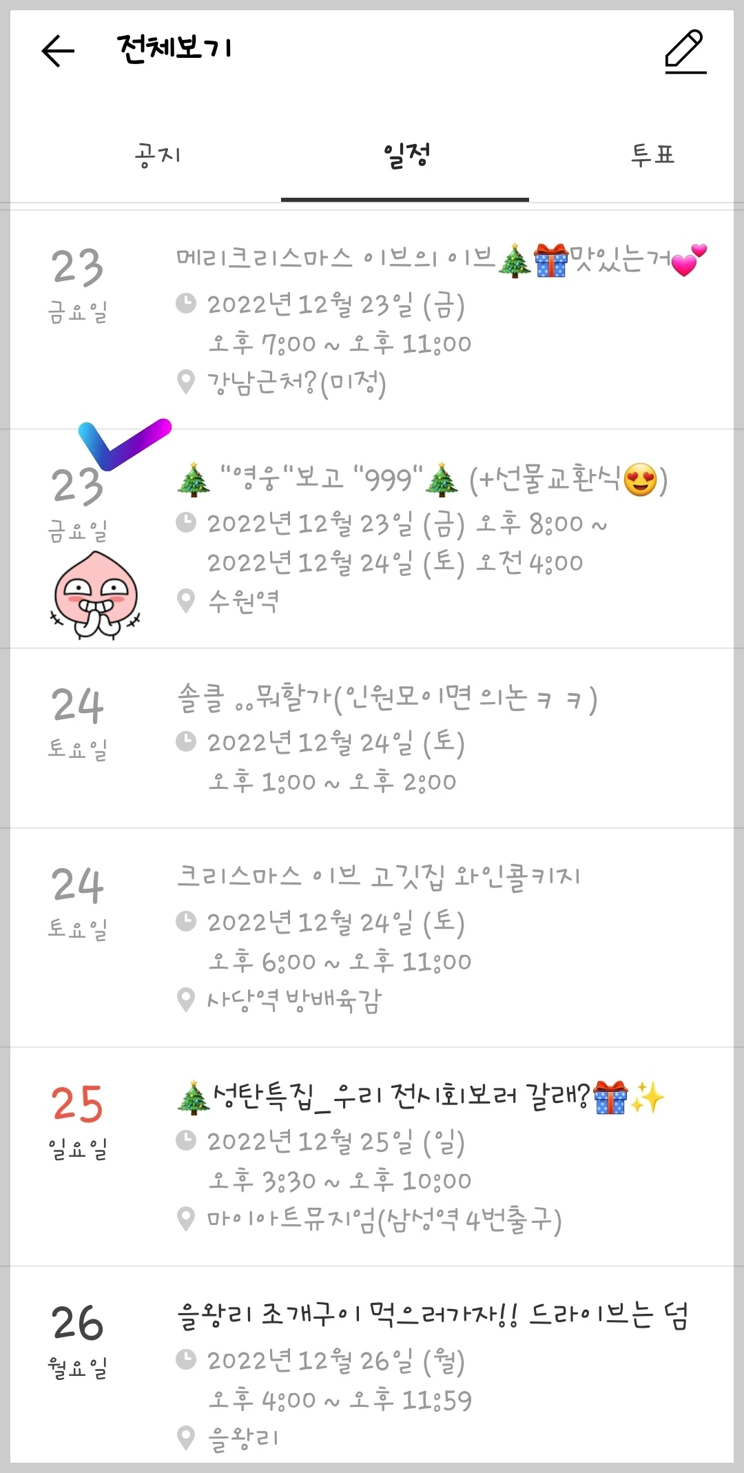 23~25일의 휴일. 심심할 때마다 자주 참여하곤 하던 '소모임' 어플. 어플의 힘을 빌려야 했다. 나처럼 심심한 솔로들이 많았는지 크리스마스에 모임이 꽤 있었다. 그중 나는 하나를 고르기로 했다.