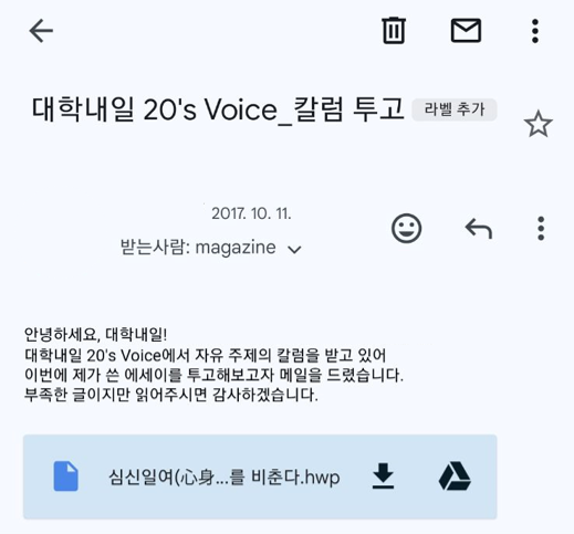 그렇게 방치 중이던 이 에세이를 발견하게 된 건 정말 상당한 우연이였다. 얼마 전부터 구독하기 시작한 유튜브 프리미엄의 무료 체험판 기간이 끝나서 유료 결제된 계정의 인보이스 메일을 확인하기 위해 접속했던 G메일의 수신함을 정리하는 중이었다. 정말 우연찮게 발신함을 눌렀는데 페이지 맨 뒷 장에 2017년 10월 11일 '대학내일 20's Voice_칼럼 투고'라는 제목의 발신 메일이 있었다. 그리고 위에서 설명했던 과거 상황의 기억들이 불현듯 스쳐 지나가서 부랴부랴 메일함을 열어 첨부파일을 다운로드하고 천천히 읽어보았다.