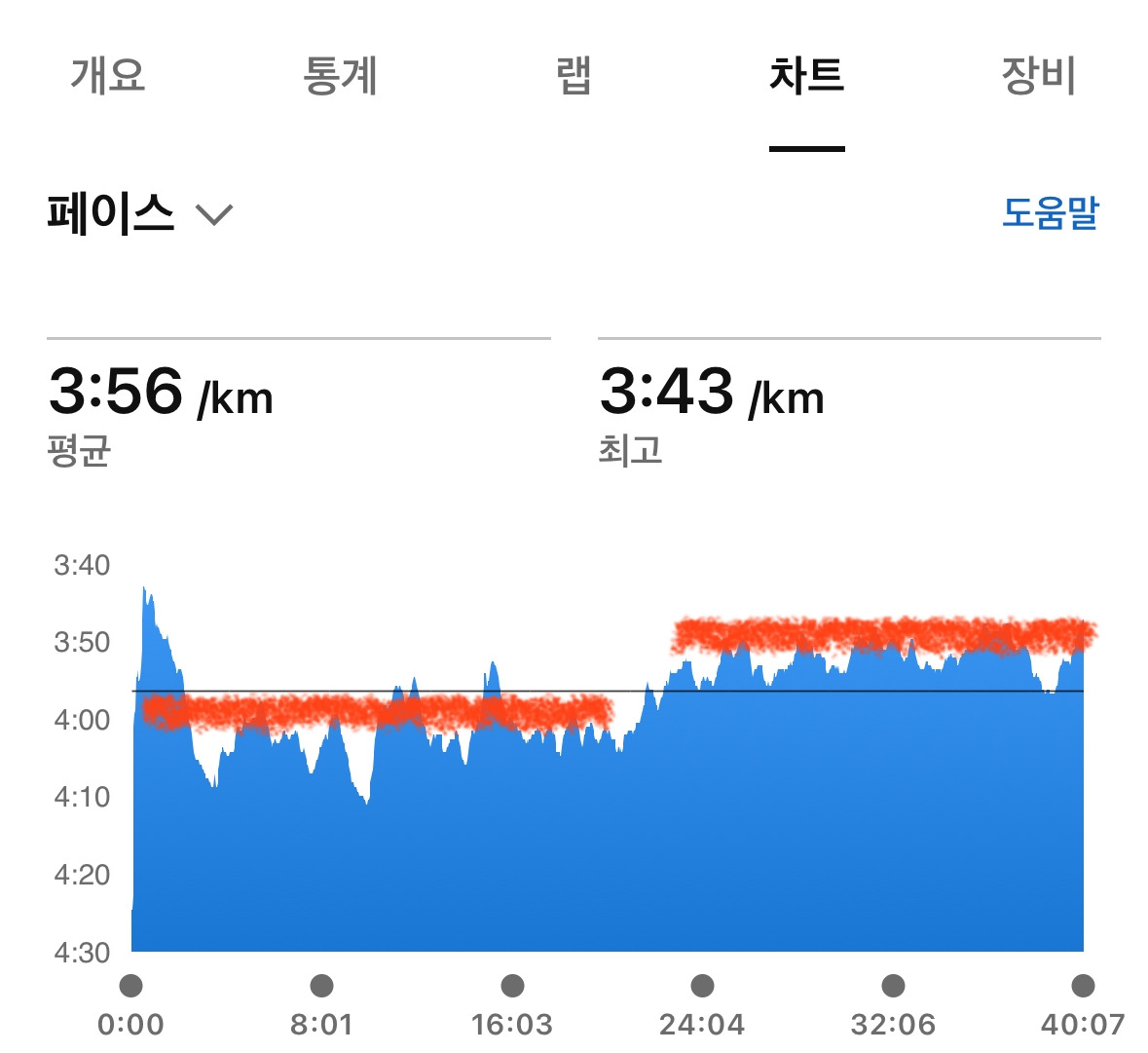 팀 훈련은 지속주 10000m 프로그램이지만 저는 내일 지속주 훈련을 하기 위해 오늘은 저강도에 가까운 중강도의 강도로 400m 인터벌 10세트만 진행했습니다.