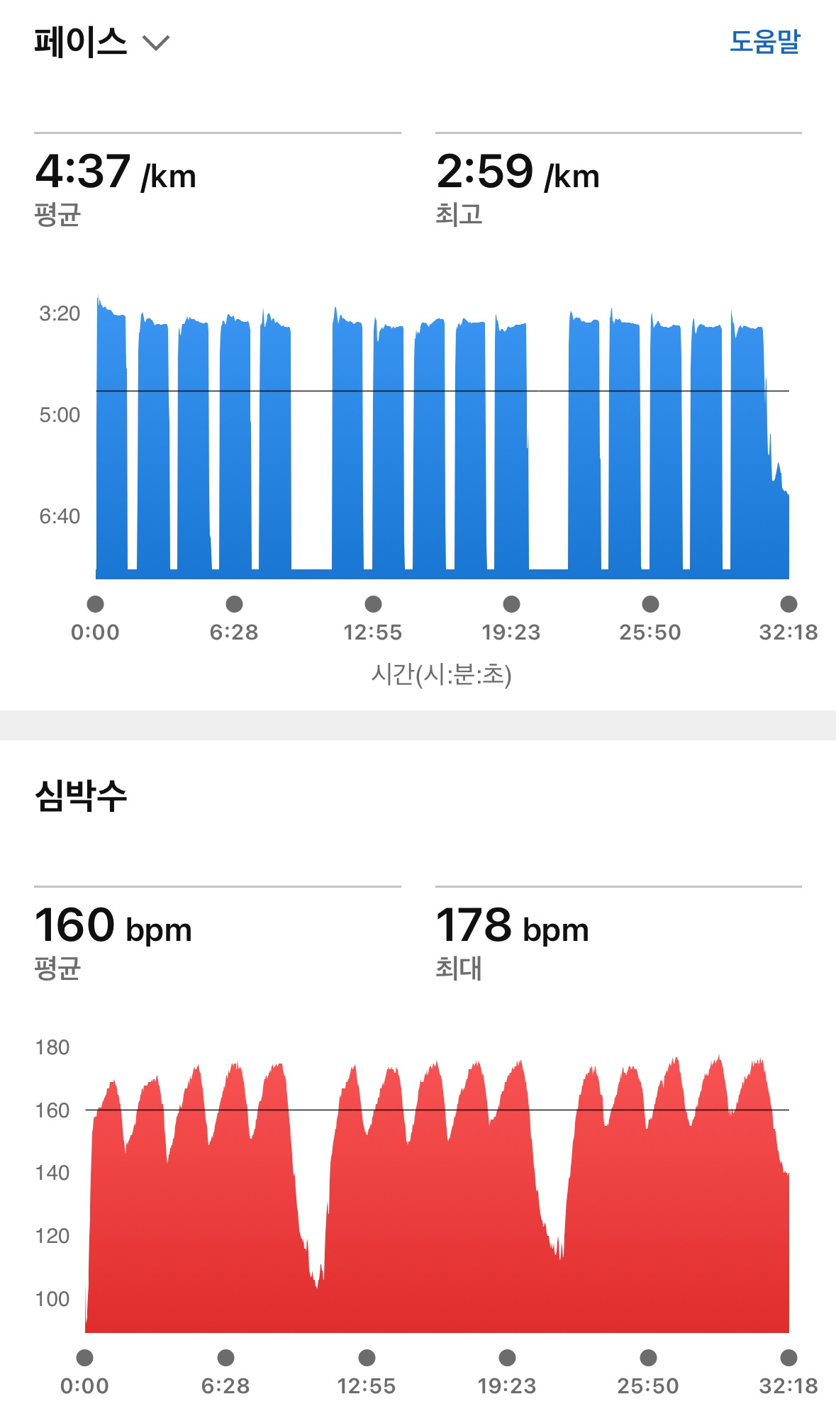 심박수 그래프가 꼭 곰발바닥 처럼 생겼습니다. 400m 인터벌 5세트마다 약간 긴 휴식을 주며 총 15세트를 진행했습니다. 랩타임이 약 85-86초 정도 페이스로 약간 호흡이 차는 정도의 강도. 앞에 형님 뒤를 차분히 따라가니 리듬도 잘 잡히고 바람도 막히고ㅋㅋㅋ