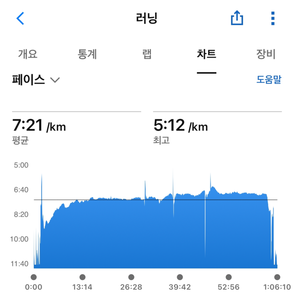 오늘은 아침 달리기의 시간이 평소보다 많이 필요합니다. 그래서 05시에 기상했습니다. 오늘 조깅은 워밍업을 위해 천천히 출발해서. 서서히 페이스를 끌어올리며 몸이 풀리기를 기다립니다. 1km마다 평균 페이스를 확인하고 한걸음만 빨리하면 빌드업 그래프를 예쁘게 그릴 수 있습니다.