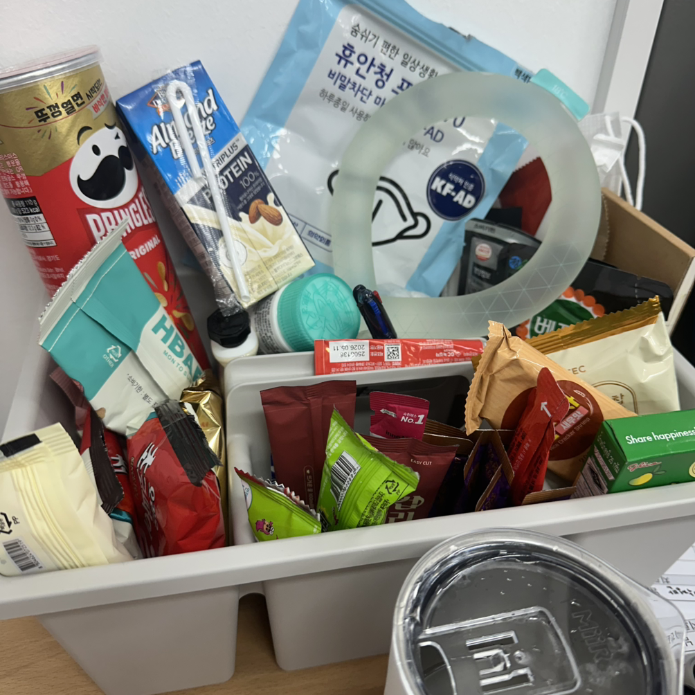 새로 일하는 직장은 동료들 여럿이 책상을 함께 사용합니다. 중간 중간 휴식 시간이 많이 있는데. 그때 그때 간식을 먹으려고 이렇게 각자 보관함에 단 것들을 쟁여둡니다. 단 음식을 끊고 사는 저에게는.. 쉽지 않은 장소가 되어버렷습니다ㅋㅋ.