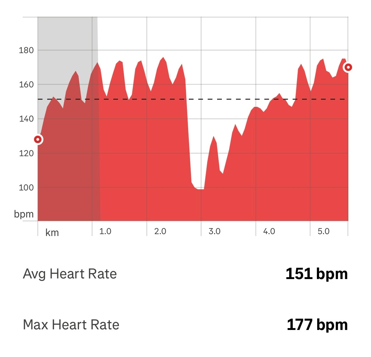 1-4km 천천히 페이스를 올리며 워밍업 겸. 노면이 좋지 못한 곳을 빠져나갑니다. 그리고 노면이 좋은 곳에 접어들며 4분 50초에서 5분 정도의 빠른 페이스의 조깅을 시작합니다. 이 페이스에서 약 40분 정도를 유지하는 것이 포인트입니다.