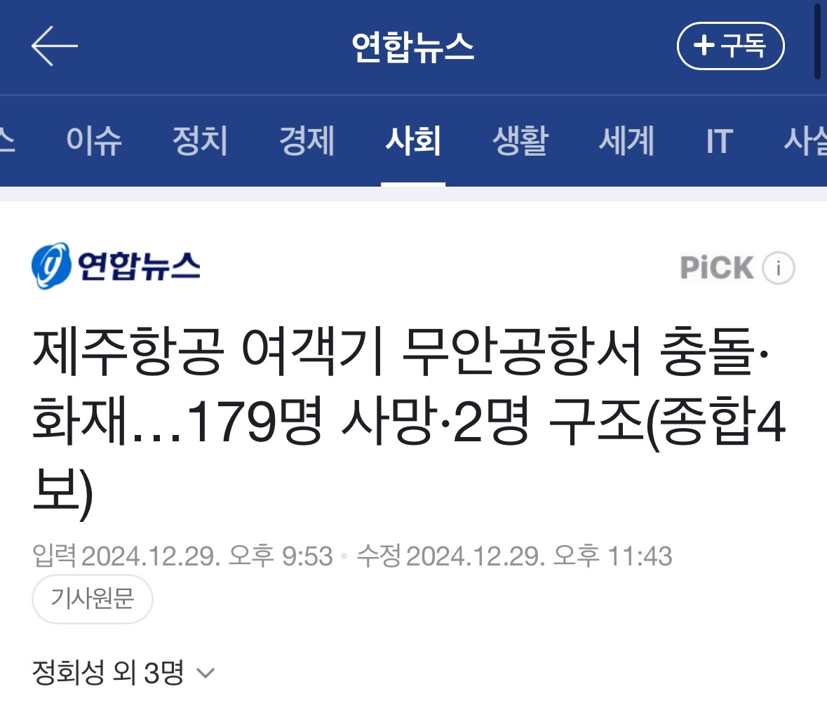 무안국제공항에서 탑승객 181명을 태운 제주항공 여객기가 착륙 중 활주로 외벽에 충돌한 뒤 화재가 발생해 179명이 숨지고 2명이 다치는 대형 참사가 발생했다.