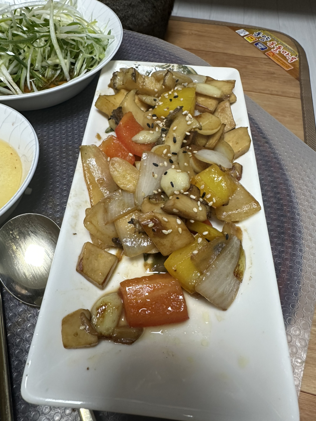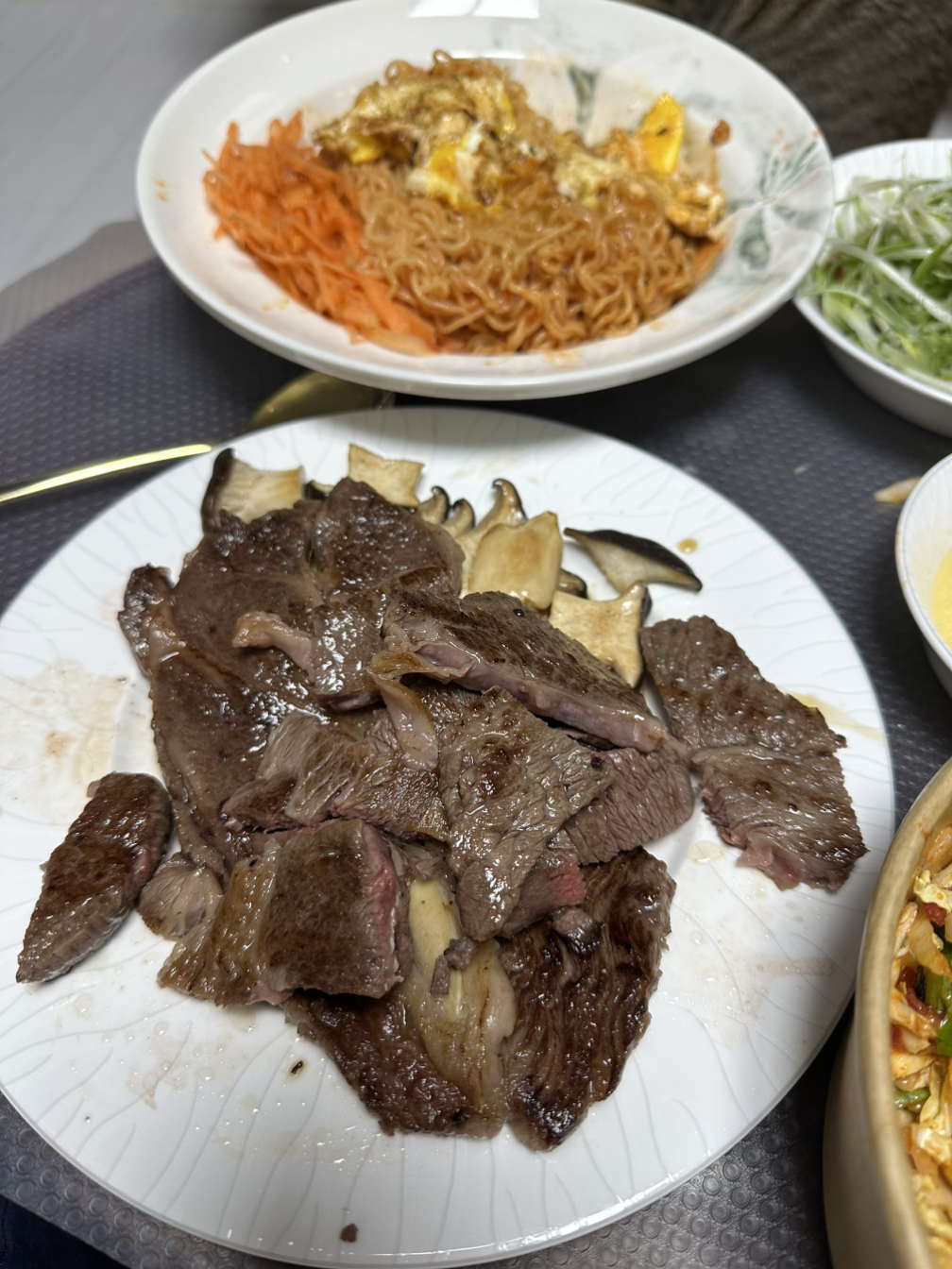 운동 마치고 돌아와 바로 외이프랑 저녁 식사를 했습니다. 전복 버터구이. 비빔면. 소고기. 내일 훈련 잘하라고.. 이렇게 신경 쓰는 게 고마우면서 미안하면서 그렇습니다.