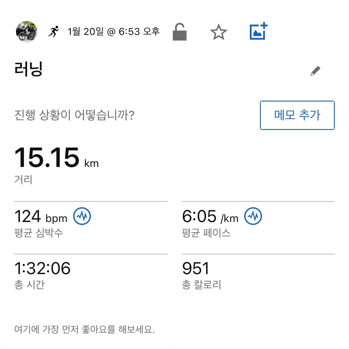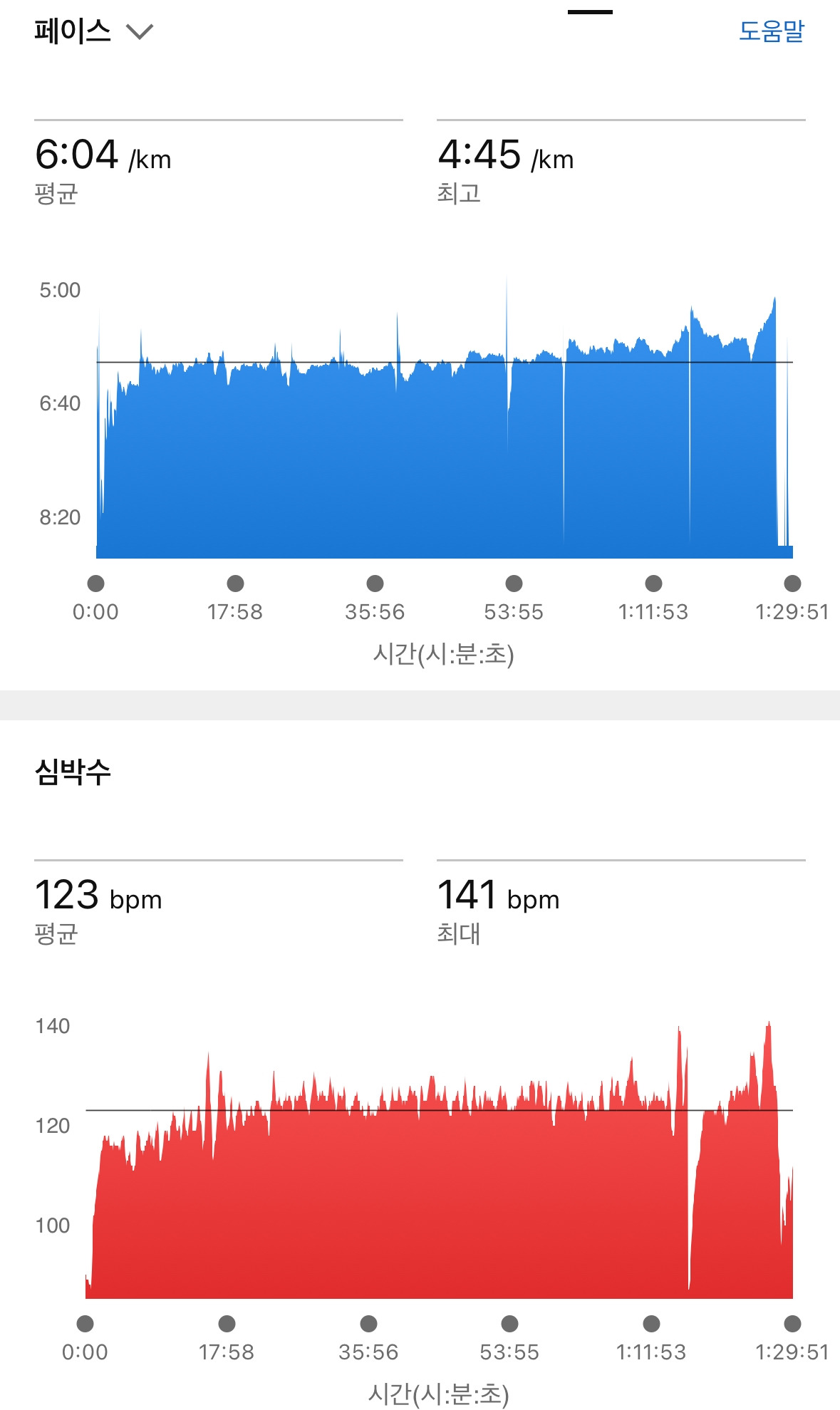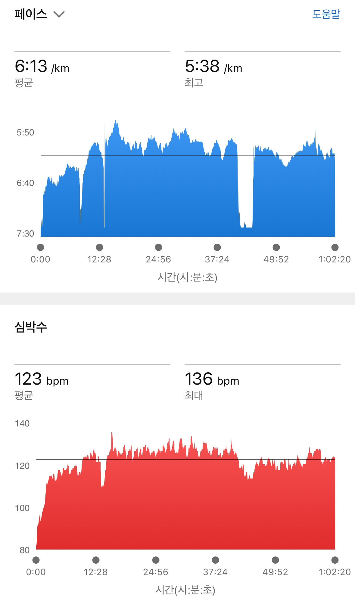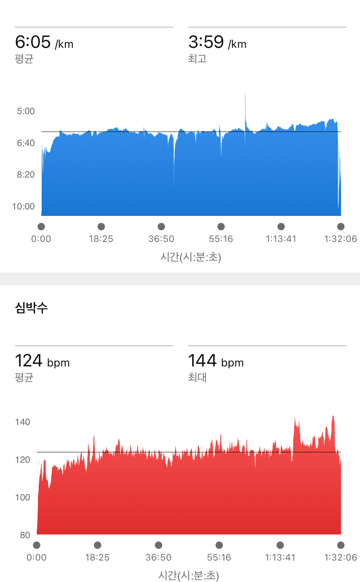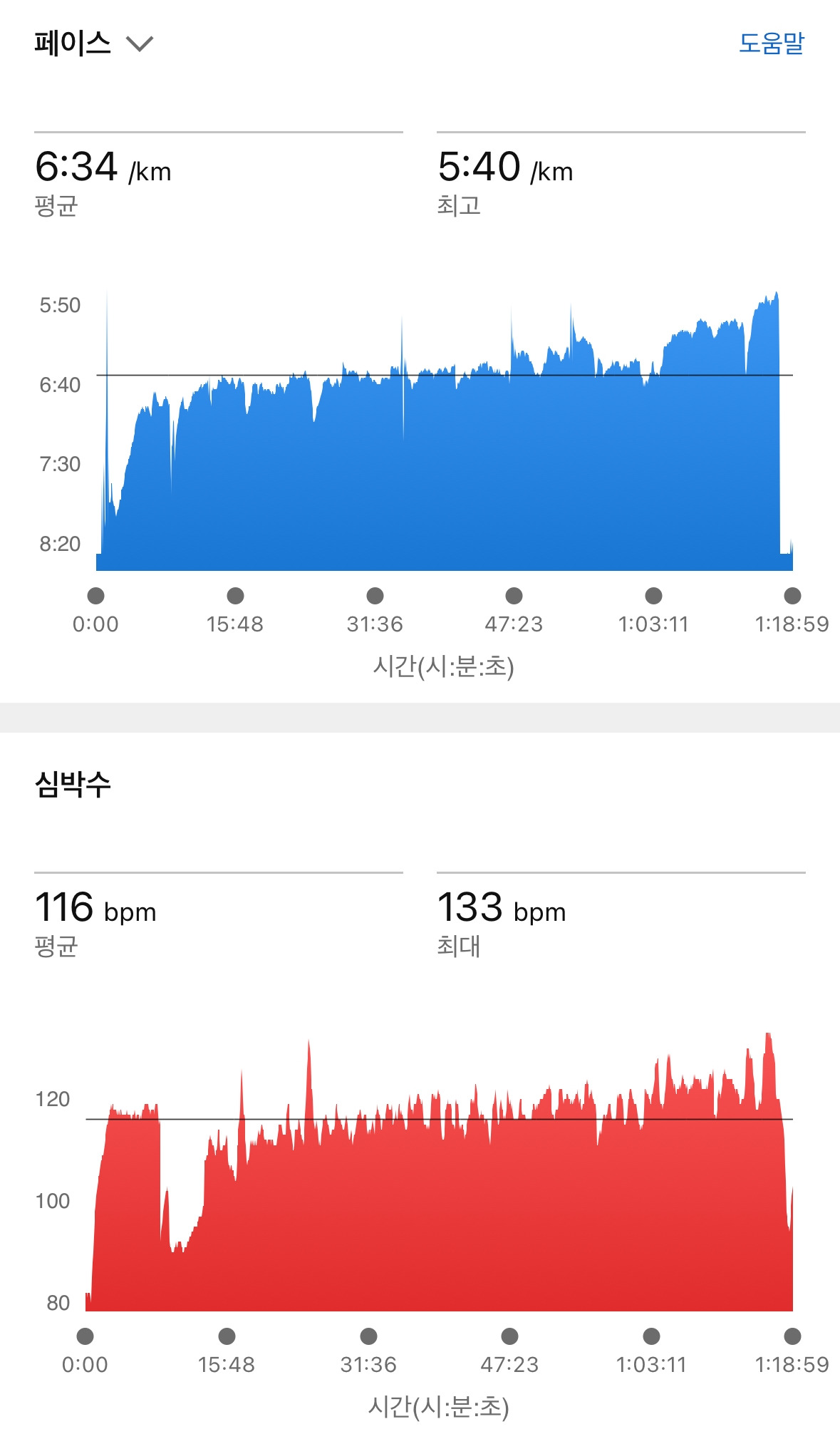 100분 또는 18km 정도 달리고 싶었습니다. 하지만 욕심만큼 달리면 아무래도 피로감이 남을 것 같습니다. 오늘 달리기가 내일 달리기에 영향을 미치지 않도록 조금 아쉽게 마무리하고 있습니다.