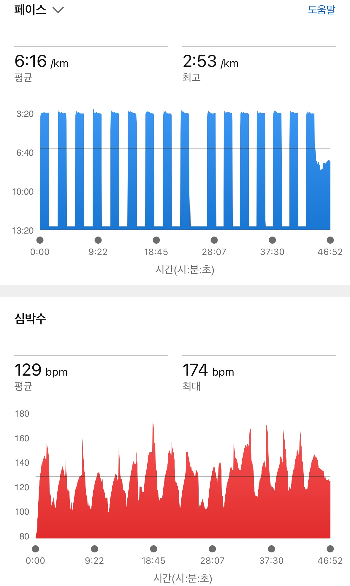 일요일 인터벌 훈련 프로그램은 3000m 1세트, 2000m 2세트, 1000m 2세트, 300m 5세트입니다. 함께 운동하는 분의 스케줄이 이렇다기에 같이 따라붙어서 한 훈련이었습니다. 수요일 인터벌 후 충분히 휴식했지만 일요일에 또 인터벌이라니.. 쉽지 않습니다.