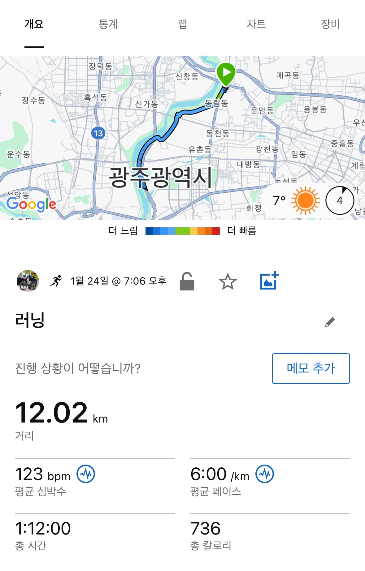 저녁 70분 저강도 조깅 12km. 훈련 부하 62.