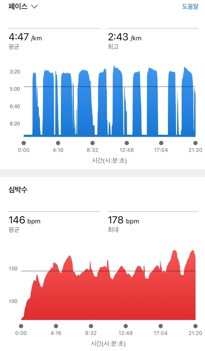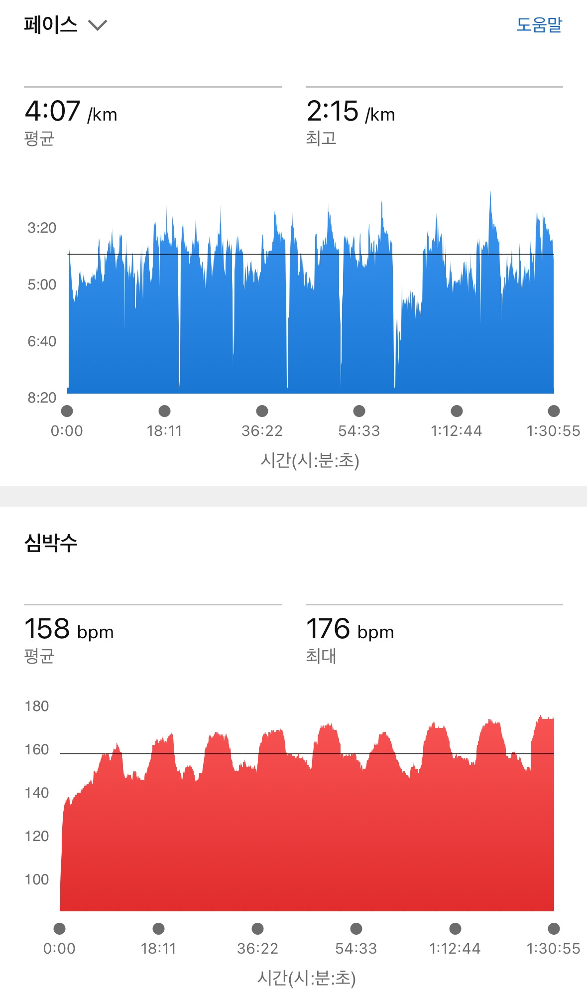 오늘 빠른 페이스 구간은 3분 50초 정도의 페이스였습니다. 훈련 전 구간은 아니었지만 6세트 빠른 페이스 구간에서도 “이 페이스의 리듬인가..?” 일정한 리듬이 조금 느껴졌습니다. 3분 50초 정도 페이스로 하프 또는 그 이상 달릴 수 있을 것 같은 느낌만. 느낌만 조금 있었습니다. 아직 풀 코스를 다 밀고 갈 정도는 아니구요. 네…