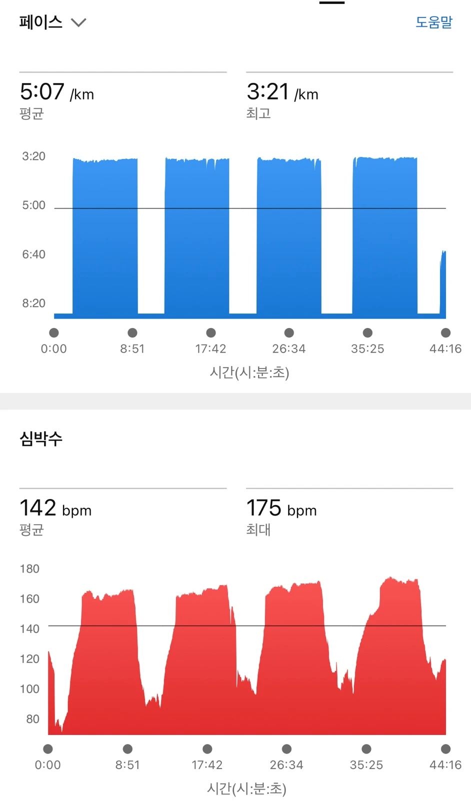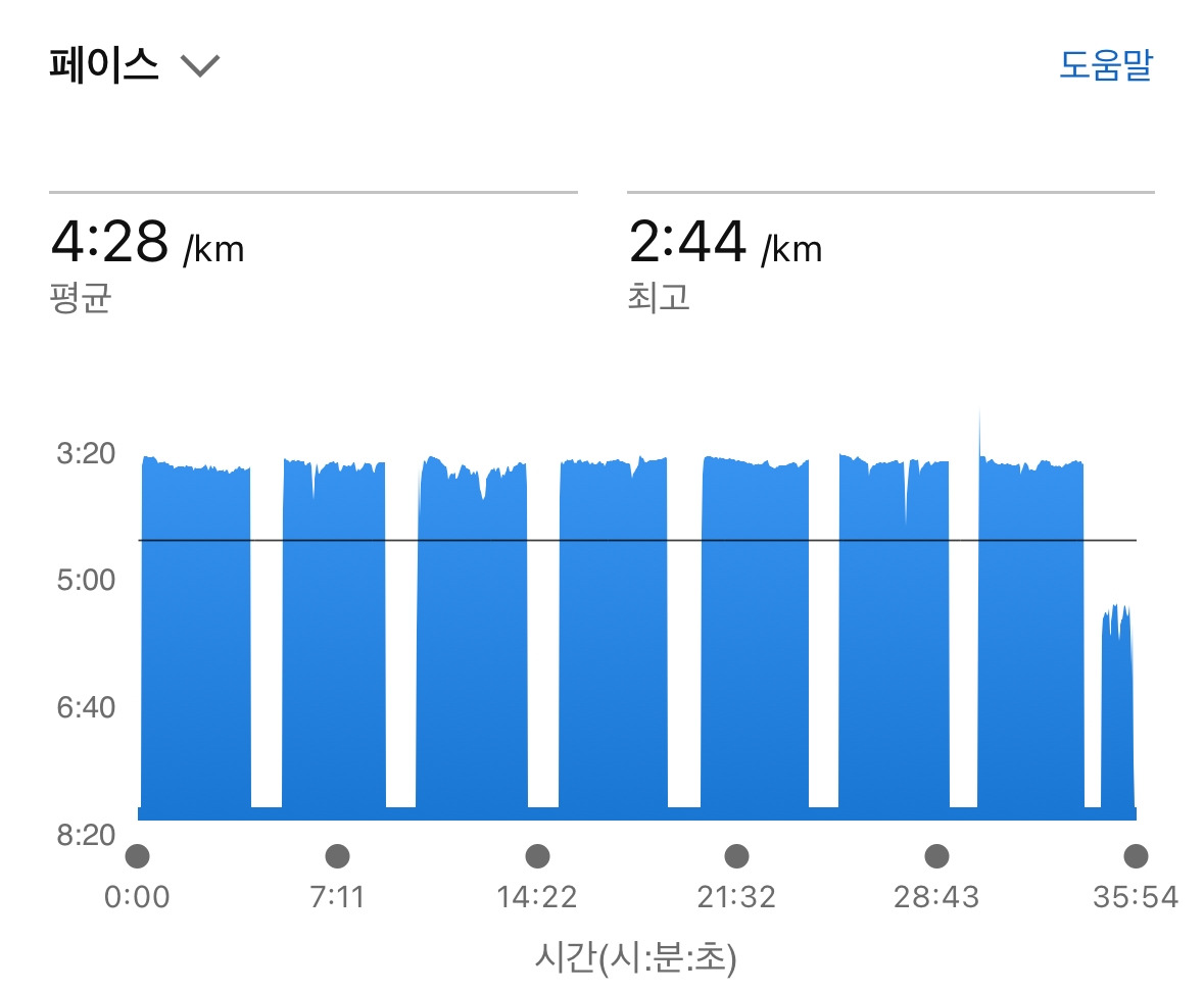 처음 2세트 3세트까지는 빠른 페이스 구간에서 힘든 낌이 조금 있었습니다만 이내 호흡도 안정되었고 강도가 더 강해지지 않는 것을 느꼇습니다. 이 느낌이 들면 훈련은 어떻게든 끝까지 할 수 있습니다.