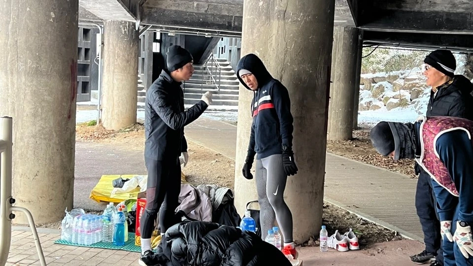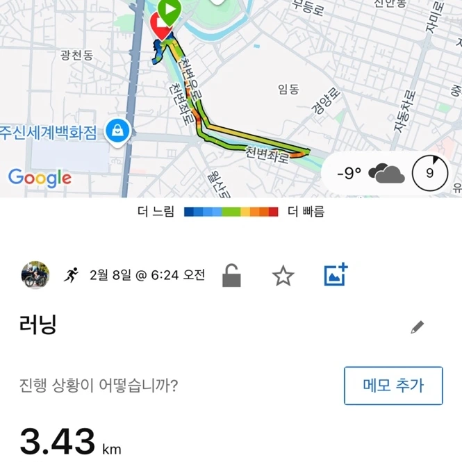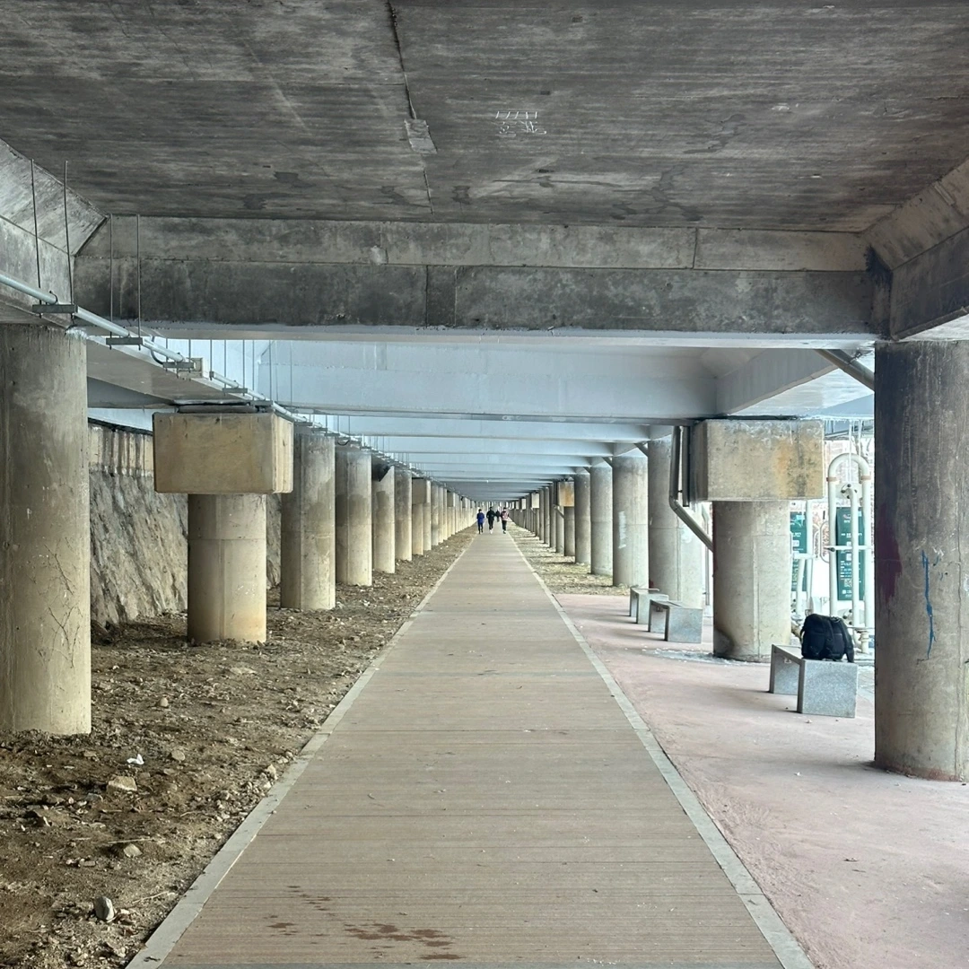 밤 새도록은 아니고.. 눈이 조금 내린 모양입니다. 훈련 장소 변경 공지가 있었지만.. 지난 밤에 내린 눈으로 훈련을 갈지 말지 고민됐습니다. 우선 대충 챙겨서 변경된 훈련 장소로 이동하니.. 참.. 할 생각이 있으면 길이 생기고 방법을 찾는다고. 천변 근처에 눈과 비를 맞지 않고 가벼운 조깅 및 산책을 할 수 있는 공간이 있었습니다. 편도 1km가 조금 넘고 왕복으로 2.5km가 찍히는 코스였습니다.