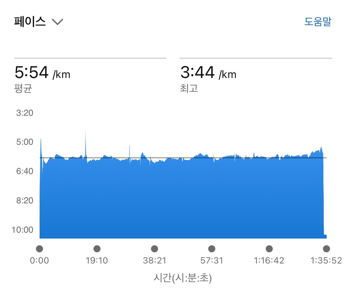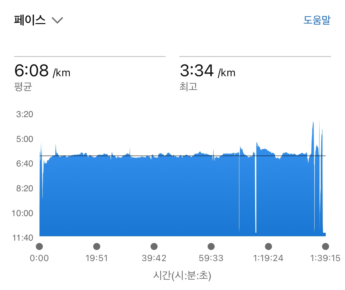 처음 1km를 지나 2-3km정도 지나면 힘을 빼고 가벼운 리듬으로 툭툭 놓으며 달리다보면 페이스가 일정하게 찍히는 것 같습니다. 도로 상황에 따라 몇초 차이가 있을 수 있지만 페이스에 큰 변화가 없도록. 느낌대로 막 빨라져버리지 않도록 유지하면 성공하는 것 입니다.