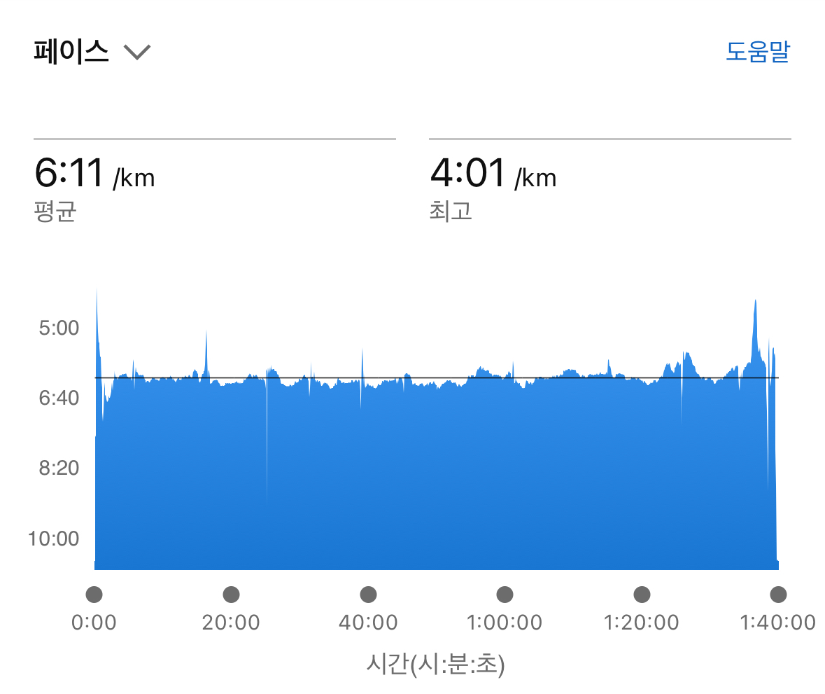 그래서. 마지막 장거리 훈련이지만 무리하지 않고 천천히 달렸습니다. 다리에 피로감이 충분히 느껴질 정도. 피로감이 느껴지지만 참고 밀고가면 밀고 갈 수 있는 4분 25-30초 페이스요.