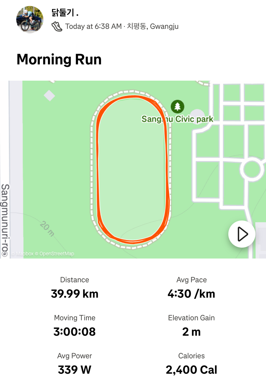 오는 주 일요일 40000m 트랙 지속주 훈련을 대비해수 훈련 강도를 조절하고 있습니다. 서울마라톤이 이제 30일정도 남은 시점이기 때문에 마지막 장거리 훈련을 진행하려고 계획했습니다. 40000m 장거리 훈련이 끝나면 사실상 테이퍼링 기간이 시작된다고 봐야할 것 같습니다.