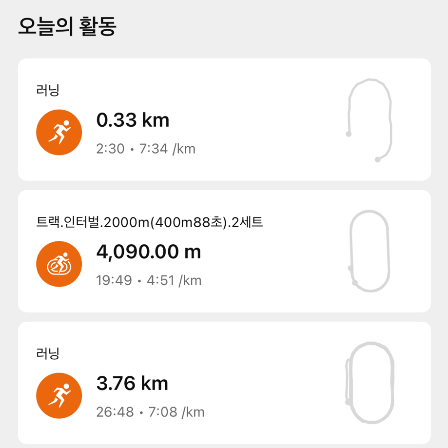 인터벌 훈련은 3000m 3분 35초 1세트. 1000m 3분 25초 3세트입니다. 이 페이스를 400m 트랙 페이스로 계산하면 86초와 82초입니다.
