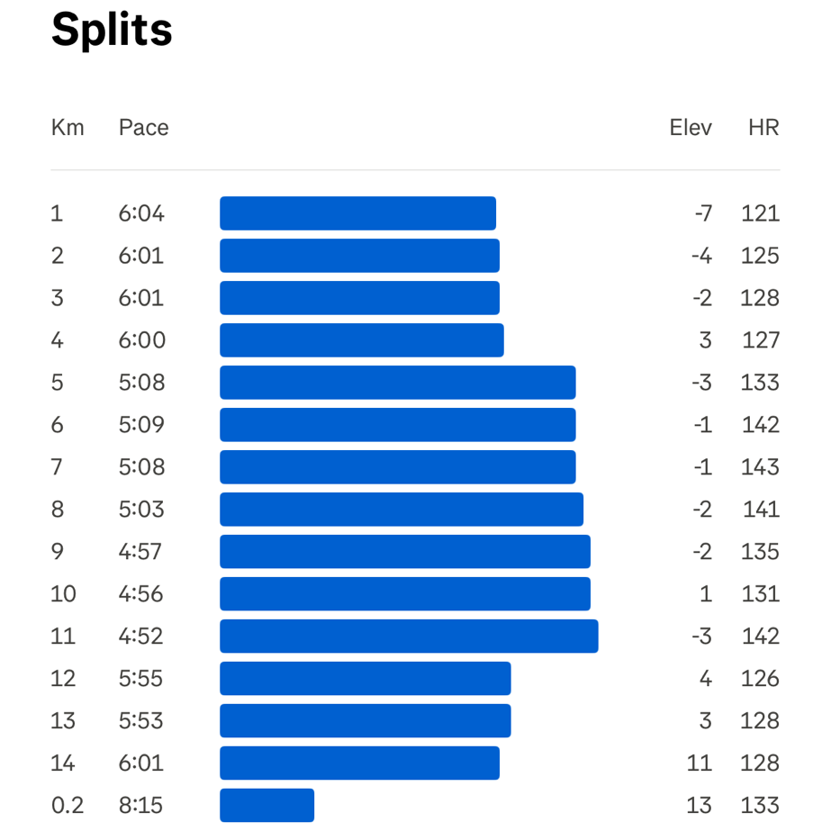 처음 4km는 6분 페이스. 7km는 5분 정도의 빠른 조깅. 3km는 다시 6분 페이스로 마무리했습니다. 그렇게 총 14km를 75분 조깅을 마쳤습니다.