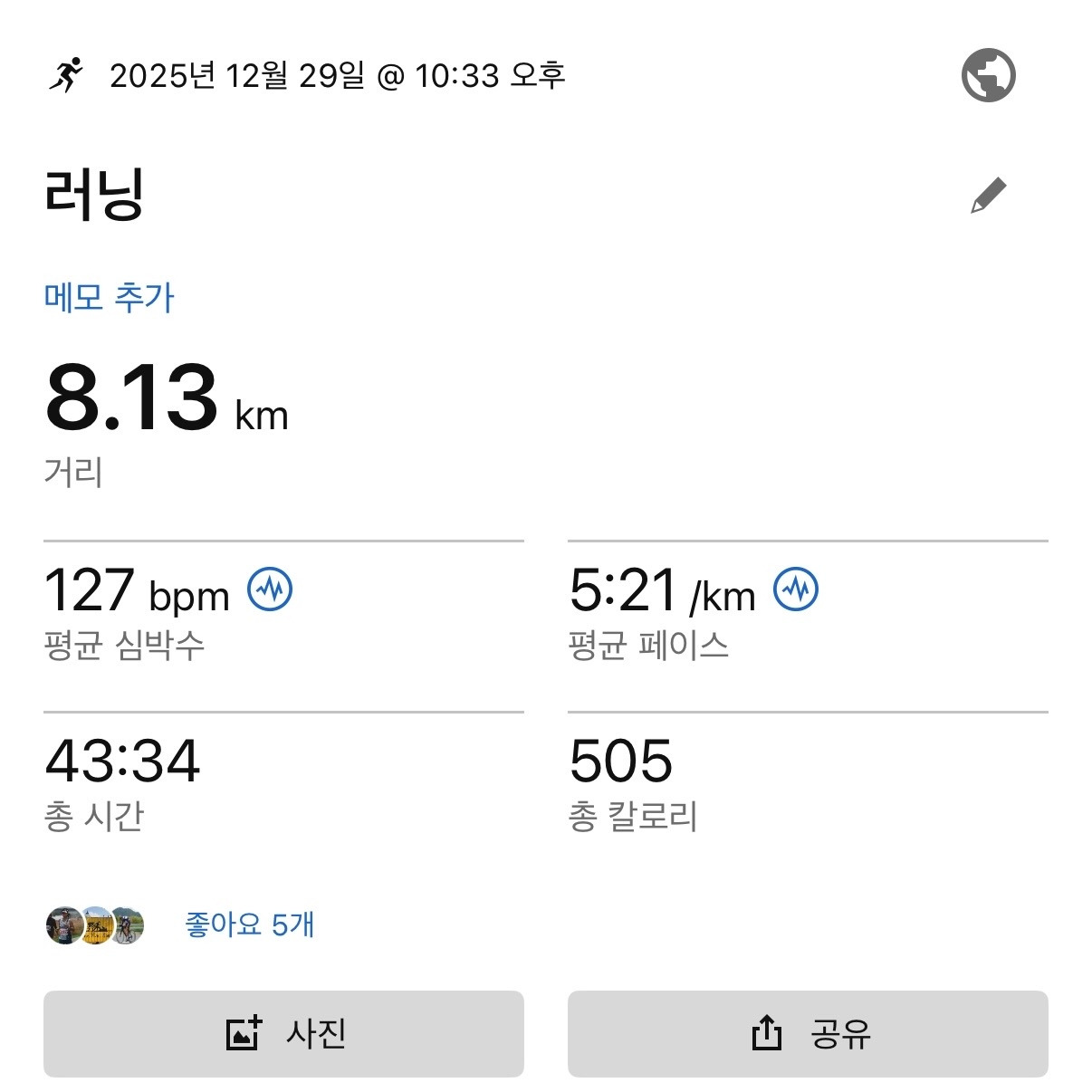 역시나 술자리였다. 26년 서울 동아 마라톤 준비 중이라 식사 후 집에 가서 조깅할 거라고 말했다. 술은 마시지 않았지만 몇 년간 함께 달린 분들이라 이런저런 에피소드를 이야기하다 보니 시간 가는 줄 몰랐다. 그렇게 22시에 먼저 나와 집에 왔다.