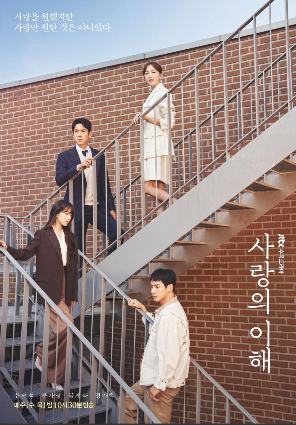 JTBC에서 방영하고 있는 '사랑의 이해'는 네 명의 남녀 간 사랑이야기다. 언제부터인가 금수저 흙수저로 계급을 나누게 되었는지는 모르겠지만, 이 네 명의 남녀 간에도 계급이 존재한다. 부잣집 외동딸로 태어나 은행에서도 잘 나가는 직원, 홀어머니 아래서 명문대를 나와 정규직으로 일하는 은행원, 고졸로 입사해 정규직을 꿈꾸는 은행 직원, 경찰공무원 합격을 위해 공부하지만 생활고로 인해 은행 청원경찰로 일해야 하는 임시직 직원. 그들이 가진 꿈은 각자 다르지만, 모두 자신의 자리에서 고군분투하며 열심히 살아가는 이 시대의 사회인이다.