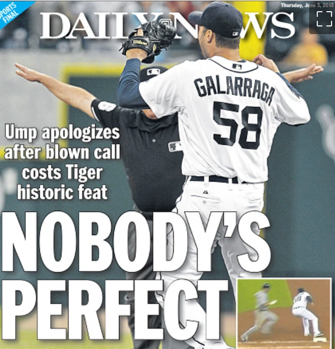 결국 알만도 갈라라가는 28개의 아웃을 잡고 완봉승을 따내는 것에 만족해야 했다. 전설의 명장 디트로이트 타이거스의 감독 짐 릴랜드는 흥분해서 짐 조이스에게 어필을 했고, 심지어 클리브랜드의 팬들조차 그에게 야유를 보내고 있었다. 당시 백악관의 주인이었던 버락 오바마마저도 오심은 정정되어야 한다는 말을 했을 정도니. 하지만, 오심도 경기의 일부라는 메이저리그 커미셔너의 판단으로 번복은 없었다. 지금처럼 비디오 판독 시스템이 있었다면 결과는 달라졌을 테지만.