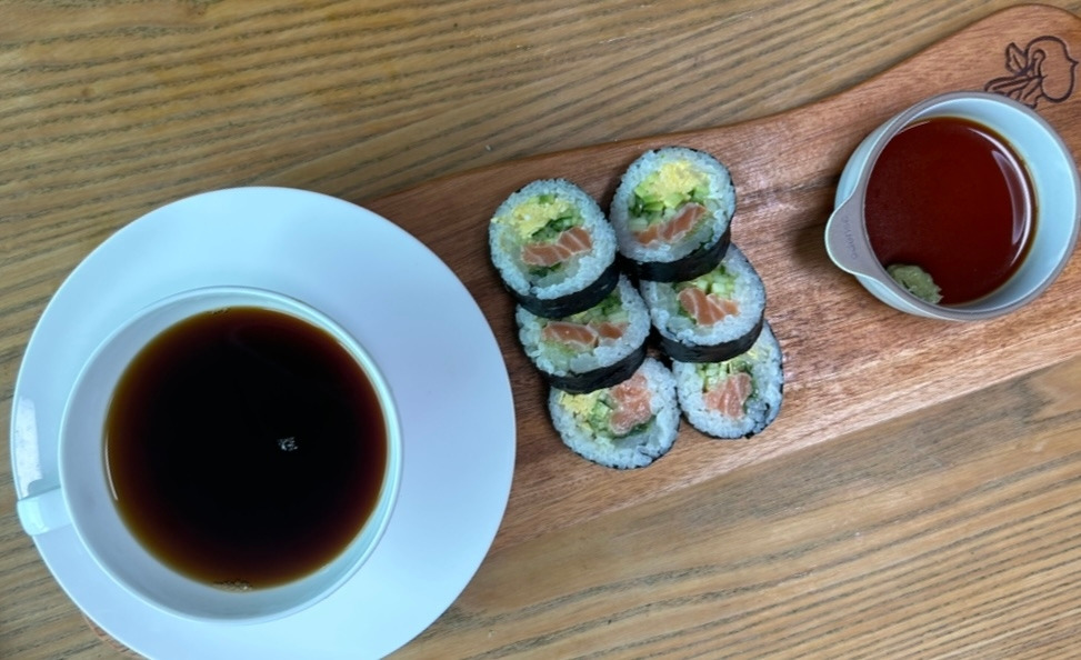 생 연어 200g, 김밥 김 3장, 하얀 쌀밥 3인분, 오이 1개, 양파 반 개, 달걀지단 1장, 아보카도 반 개, 무순 30g, 단무지 3개, 고추냉이, 양조간장, 단촛물(식초, 설탕, 소금), 참기름