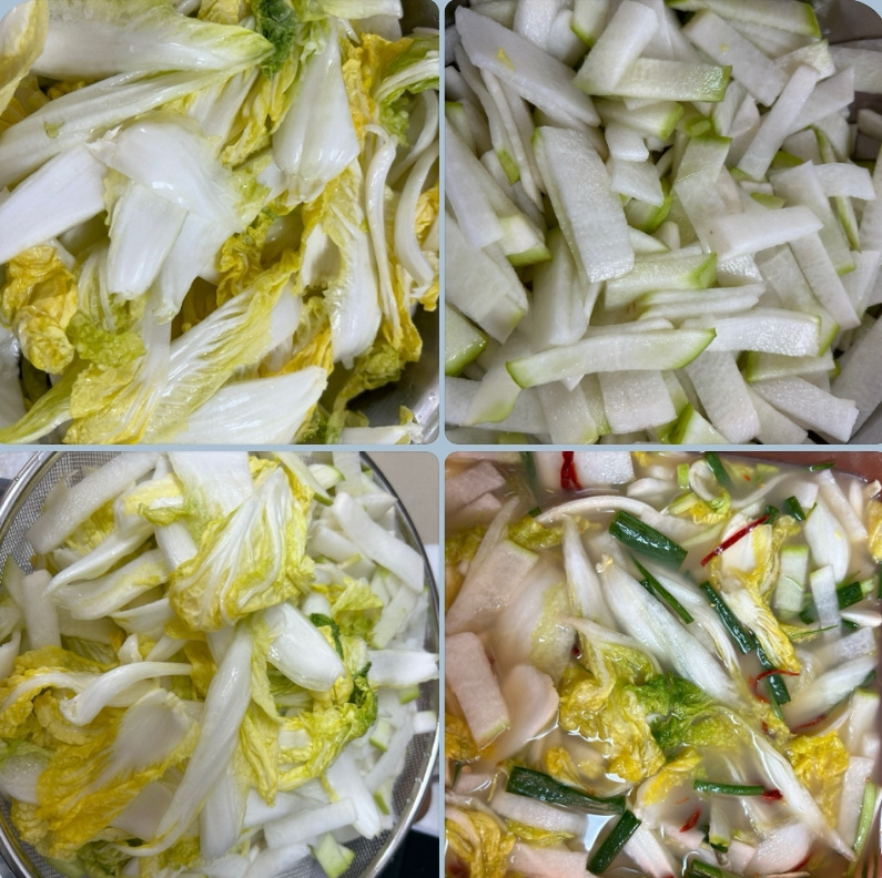 이번에 담근 김치는 일명 <White 물김치>이다. 백김치에 물김치를 섞어 놓은 듯해서 내가 지은 이름이다. <백김치>하면 왠지 고상하고 우아한 느낌이 들지만, 내가 담근 김치는 전혀 고상하지도 우아하지도 않은 막 담은 <막김치>에 가깝다.