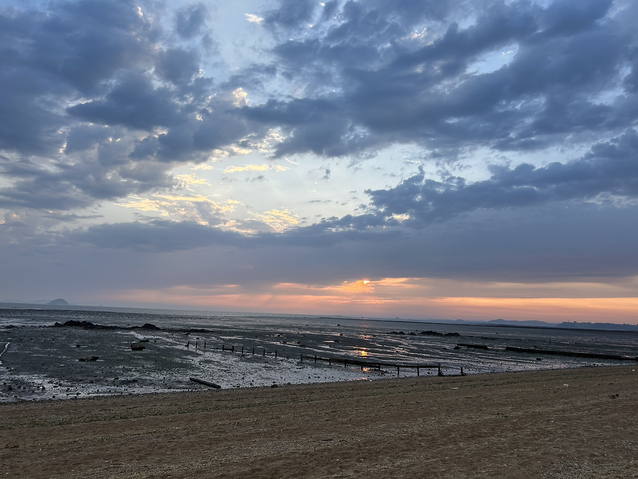 잠깐 카페에 들러 빵을 사 갖고 나오는 동안 고새를 못 참고 붉은 노을이 사라지고 만 것이다. 하늘도 희뿌옇게 변하면서 붉은 노을의 발자취도 거의 사라지고 없었다. 황홀할 정도로 붉은 노을을 기대하고 달려왔는데... 붉그튀튀 한, 좀 모양이 빠지는 붉은 바다를 보고 있자니 은근히 부화가 나려고 했다.
