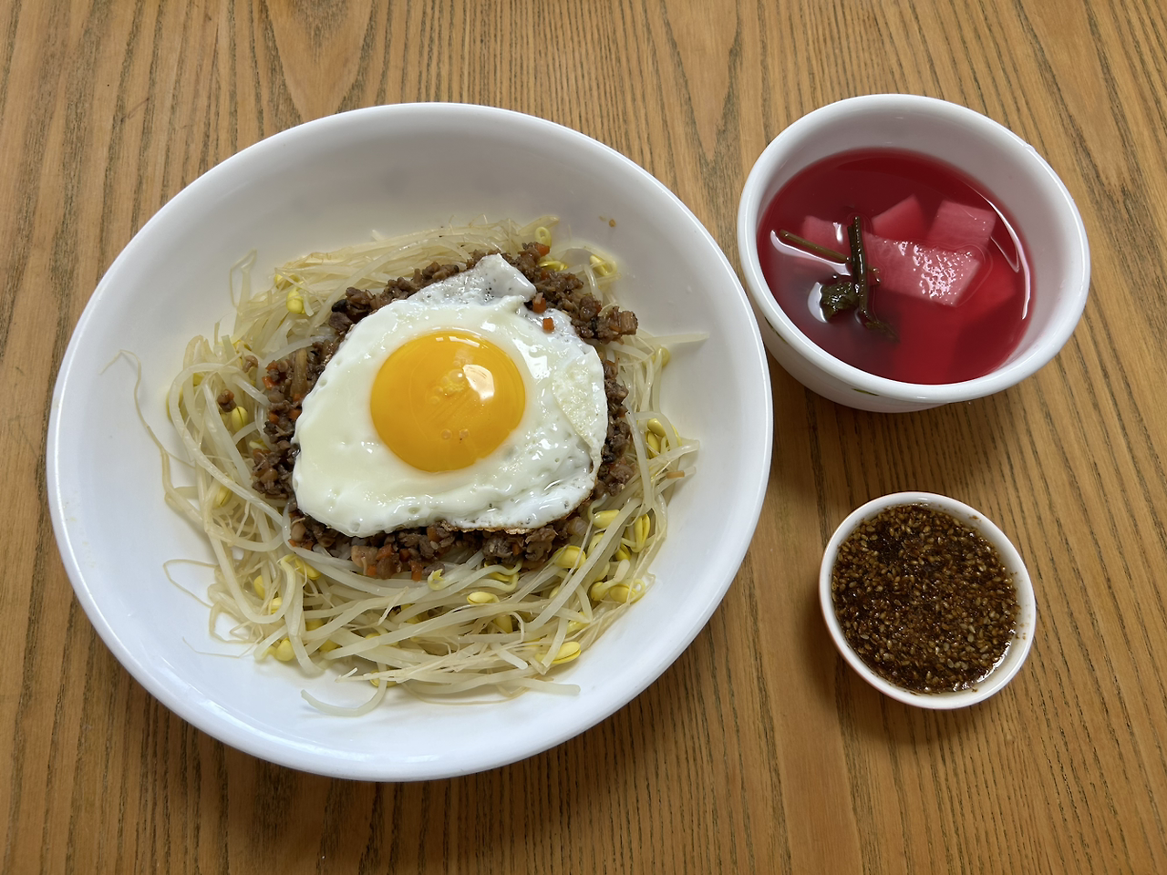 5. 그릇에 밥(반 공기)을 놓고 그 위에 콩나물(150g), 그 위에 소고기 볶은 것, 그 위에 달걀 프라이를 얹는다.