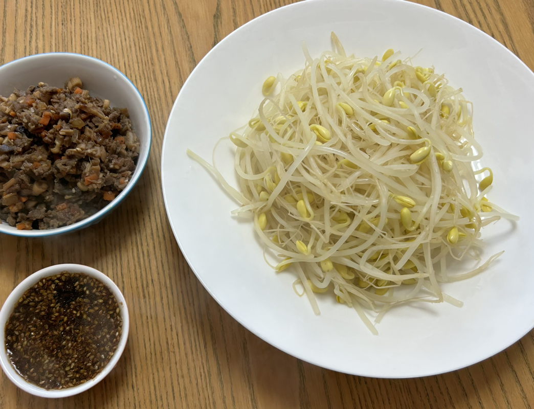 1. 콩나물을 잘 씻어 찜기에 넣고 익힌다(약 5분 정도 끓인 뒤 불을 끄고 잔열에 뜸을 들인다).