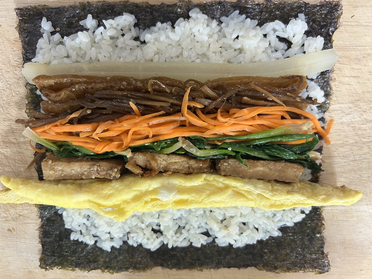 * 선재스님의 <두부김밥>에는 달걀, 어묵을 사용하지 않았다. 달걀과 어묵을 좋아하기 때문에 내 마음대로 넣어 <퓨전 두부김밥>을 말아 보았다. 김밥은 냉장고를 열어 보이는 재료들로 그때그때 다양하게 만들 수 있어 흥미로운 요리이다.