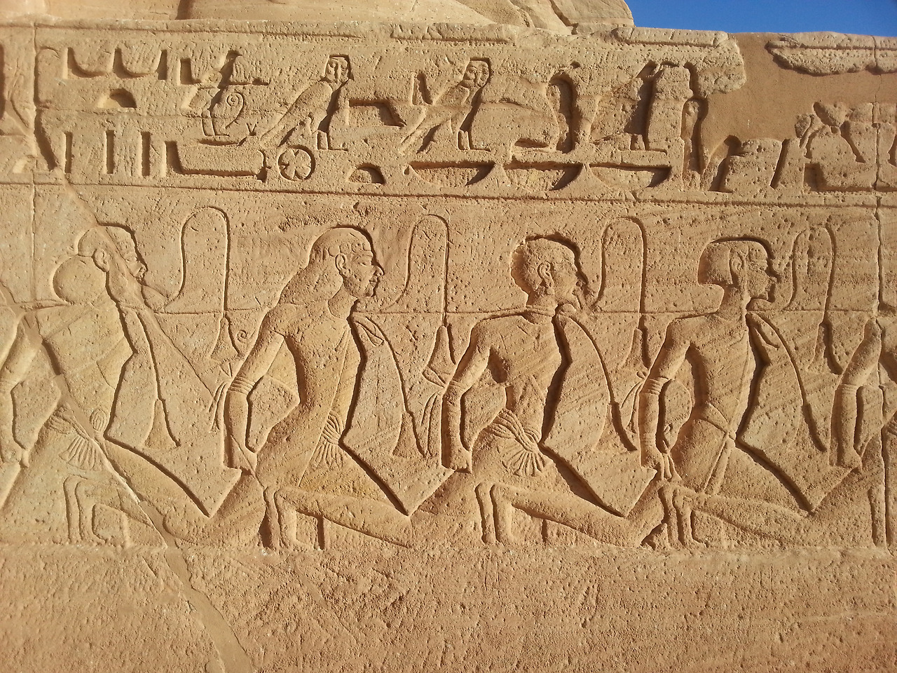 신전 안쪽은 다시 63m나 파고 들어가 있고 그 안에는 신과 왕에 대한 벽화들이 가득하다. 내부에 세 신과 람세스의 석상이 나란히 있는데 2월 20일 경과 10월 20일경의 아침 첫 햇살이 석실의 전신을 비춘다고 한다. 물론 그때도 죽음의 신 프타하에는 해가 비추지 않는다.