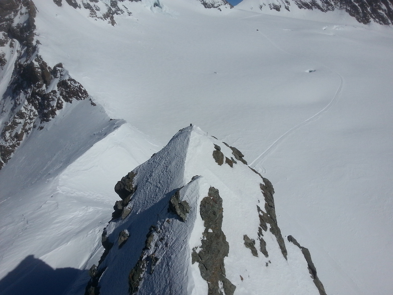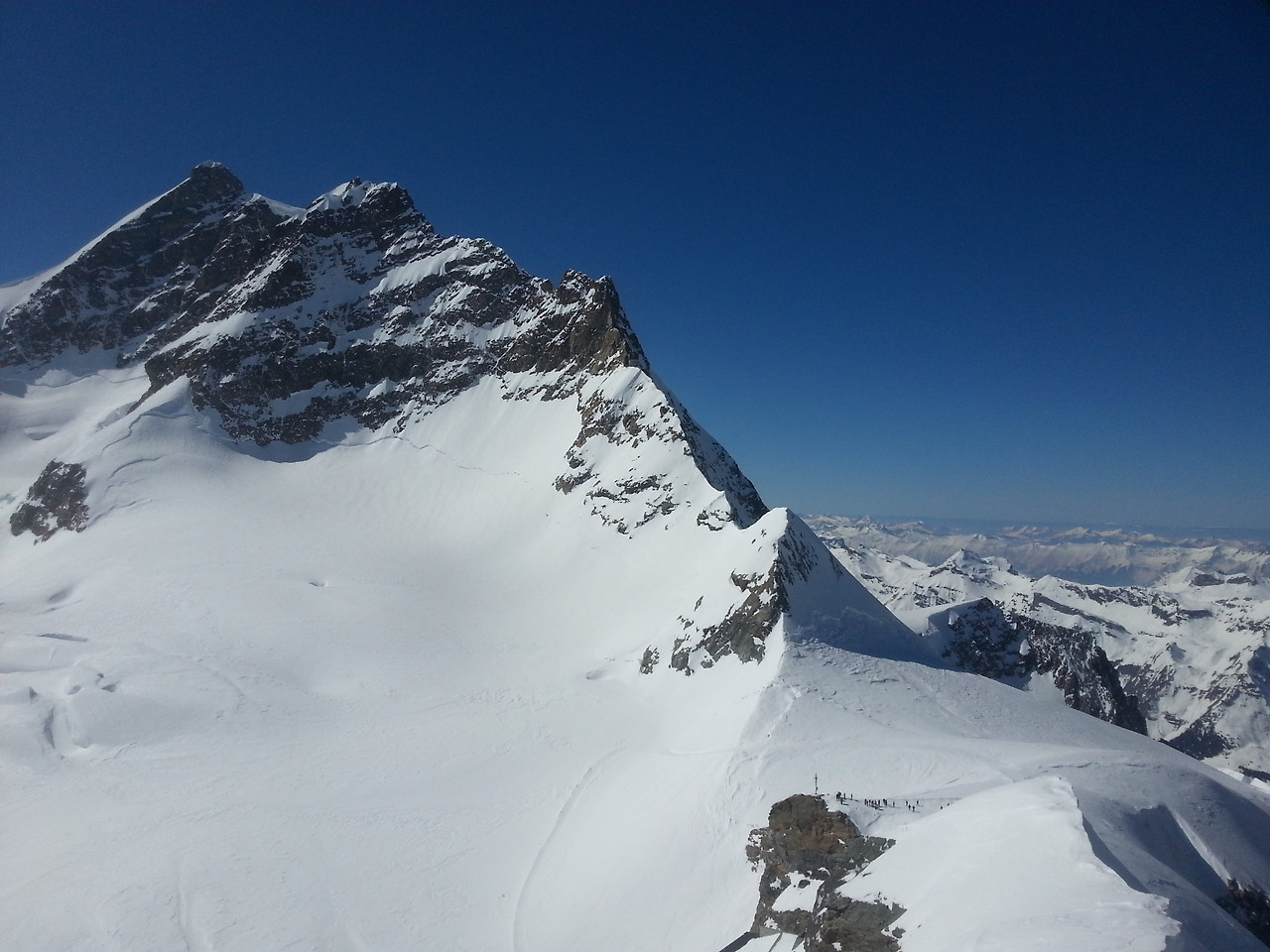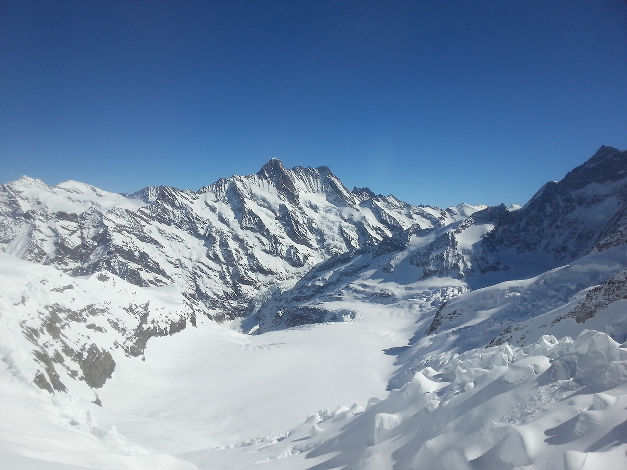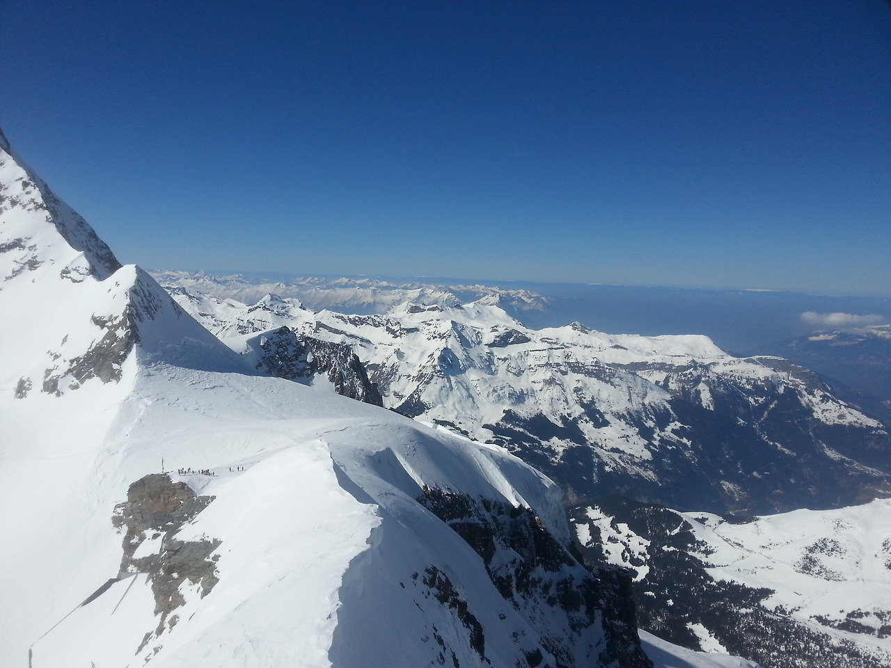 궂은날이 많다는데 운이 좋았나 보다. 만년설과 빙하의 세계가 눈앞에 펼쳐진다. 117m 정도 더 높은 스핑스 테라스(3,571m)에 오르니 남쪽에는 이탈리아 산봉우리까지 이어지는 알레치 빙하가 끝없이 펼쳐진다. 또 북쪽은 독일까지, 서쪽으로 프랑스까지 끝도 없는 장엄한 산줄기가 펼쳐진다.