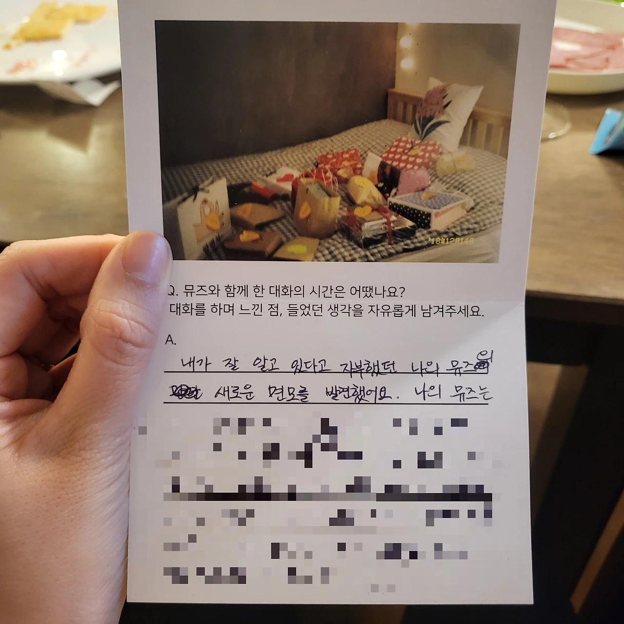 대화가 끝나면 또 하나의 기쁨을 누리게 된다. 번호가 쓰여 있던 초대장은 사실 엽서다. 뮤즈와의 대화를 마무리하기 전, 이 대화를 통해 느낀 점을 쓴다. 한 시간 동안 집중해 이야기를 나눈 상대에게 위로와 격려의 쪽지를 받으면 실로 치유되는 느낌을 받는다.