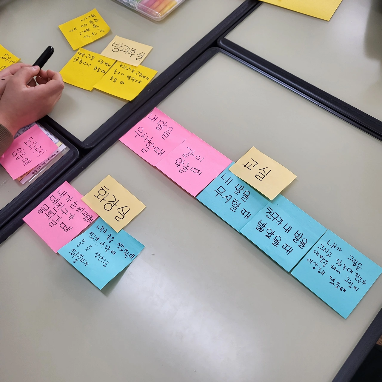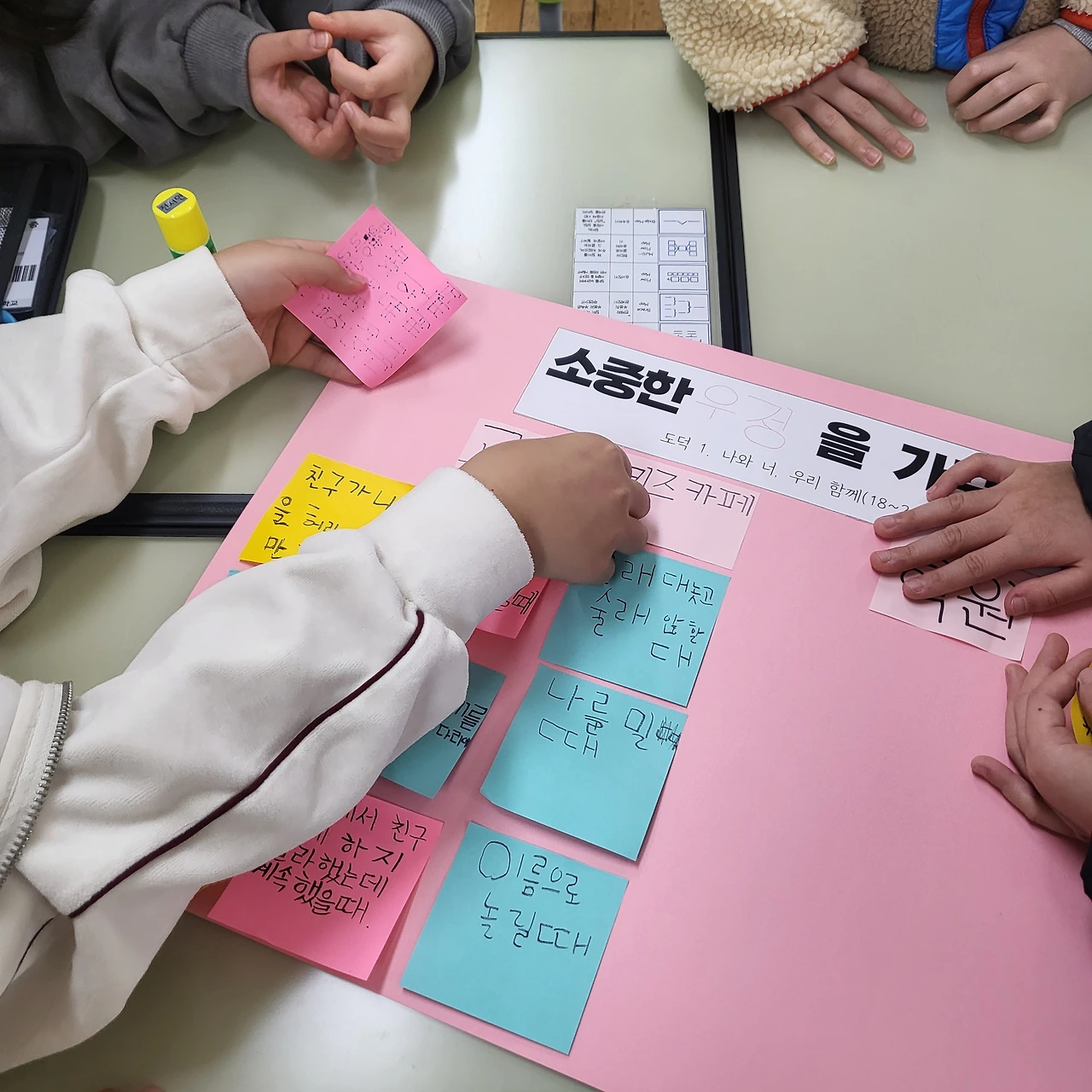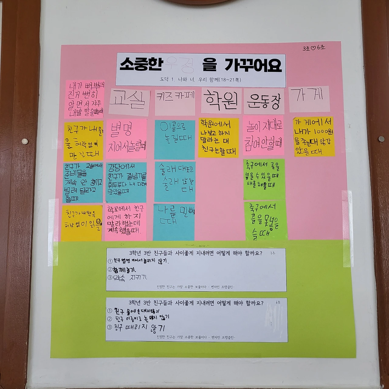 한 번은 친구의 소중함을 이해한 뒤, 잘 지낼 수 있는 방법에 대해 생각해 보는 차시가 있었다. 아이들은 학교에서 화가 났던 상황을 떠올렸고 이를 장소별로 분류했다. 그리고 친구와 사이좋게 지낼 수 있는 방법을 일반화했다. 이를 통해 아이들이 수긍하는 우리 반 규칙을 만들었다.